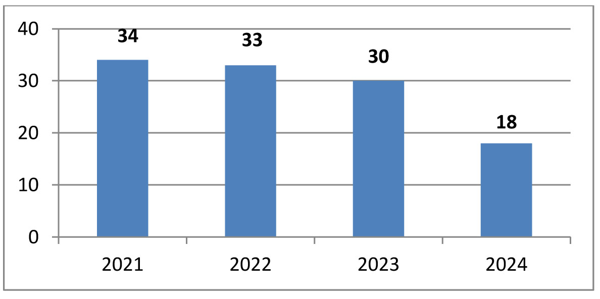 Согласно анализу, наиболее уязвимым для развития критической ситуации является срок беременности менее 22 и более 34 недель (рис. 4). Необходимость в выезде бригады АДКЦ, согласно полученным данным, за период с 2021 по 2024 г. уменьшилась в 1,8 раза за счет концентрации пациенток с КАС в учреждениях 3-го уровня (рис. 5).