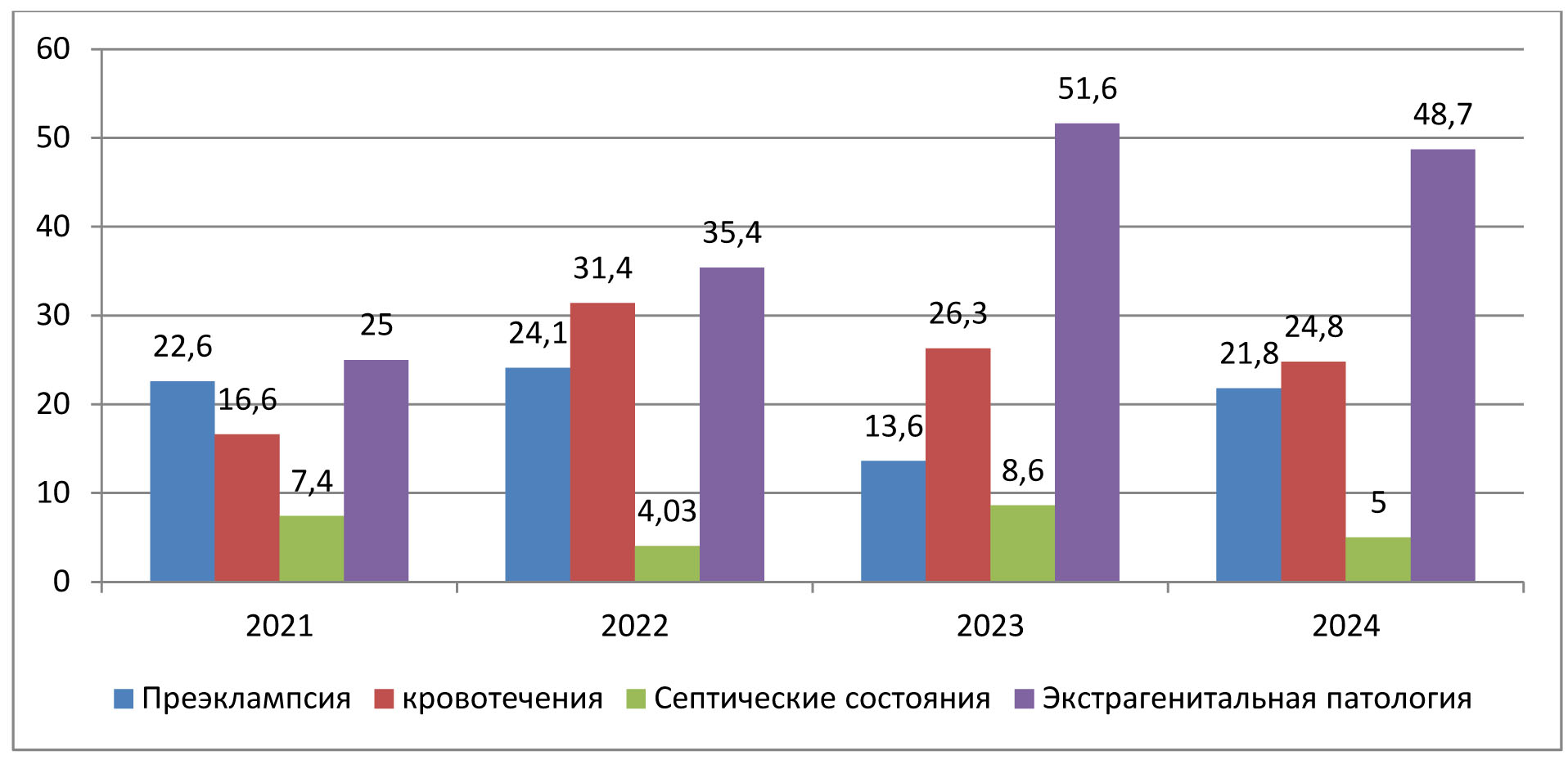 При анализе основных причин развития критической акушерской ситуации в Волгоградском регионе доминирует экстрагенитальная патология, число которой увеличивается с каждым годом (в 1,9 раза за период 2021–2024 гг.).