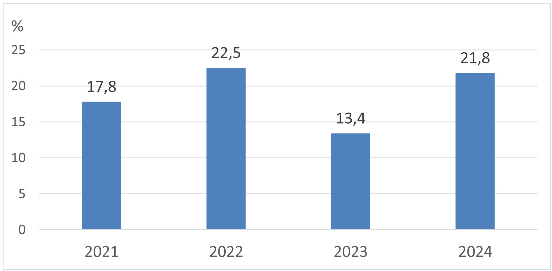 Тяжелая преэклампсия продолжает оставаться в числе одной из ведущих причин КАС. За период с 2021 по 2024 г. четкой тенденции к уменьшению процента развития данной критической акушерской ситуации нет (рис. 8). Несомненным резервом снижения КАС и МС являются своевременная профилактика развития крайне тяжелых форм преэклампсии, адекватная тактика ведения тяжелой преэклапсии у пациенток с экстрагенитальными заболеваниями, своевременная маршрутизация пациенток с преэклампсией в стационары третьей группы.