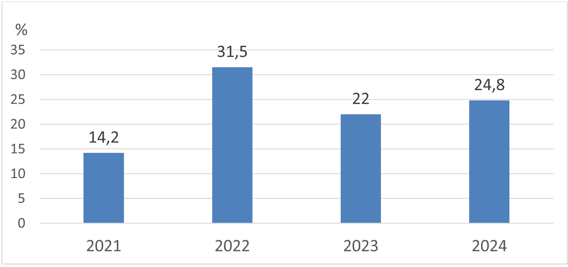 Согласно докладу Климова В.А. «Материнская смертность и критические акушерские состояния в Российской Федерации 2024–2025 гг.» на XXXI Всероссийском Конгрессе 4–6 марта 2024 г., в 2024 г. в Российской Федерации зарегистрировано 10 502 случая КАС, в ЮФО – 1 059 случаев (далее в статье используются данные из доклада – Ред.). Анализ структуры КАС в Волгоградском регионе за период с 2021 по 2024 г. демонстрирует рост (в 2,3 раза) зарегистрированных случаев КАС.