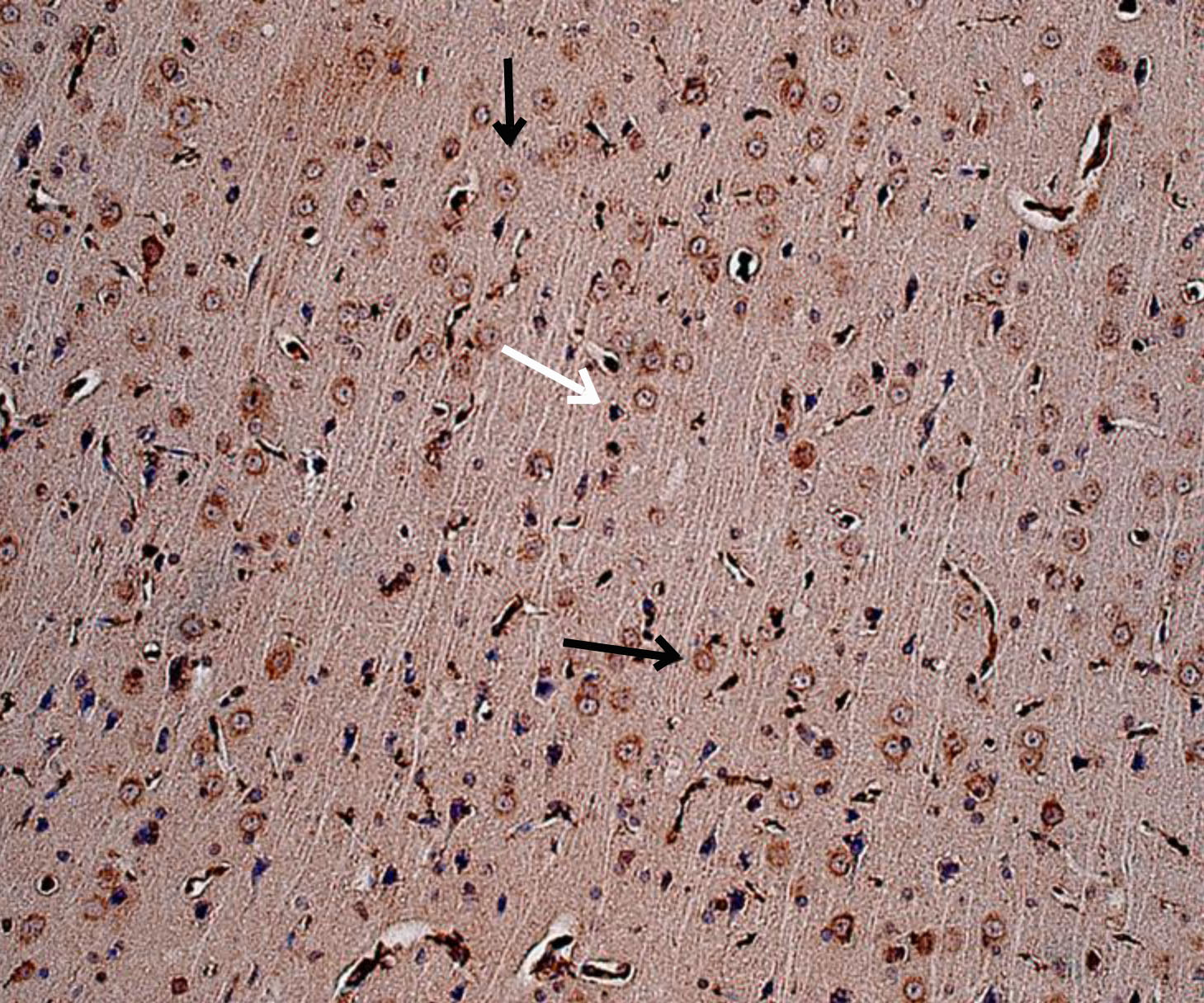 Рис. 4. Животное с СД1 (лечение – сукцикард) – от слабой до умеренной экспрессия ИРМ IL-6. Иммуногистохимическое исследование, антитела против IL-6. Увеличение ×200. Черные стрелки – экспрессия в неповрежденных нейронах. Белые стрелки – экспрессия в нейропиле
