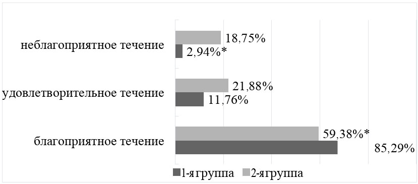 Сравнительный анализ промежуточных результатов выявил преобладание хорошего результата в 1-й группе в 1,5 раза (p < 0,05). Неудовлетворитель-ный результат в 2 раза чаще встречался во 2-й группе, но различия оказались статистически не значимы (p > 0,05) (рис. 3).