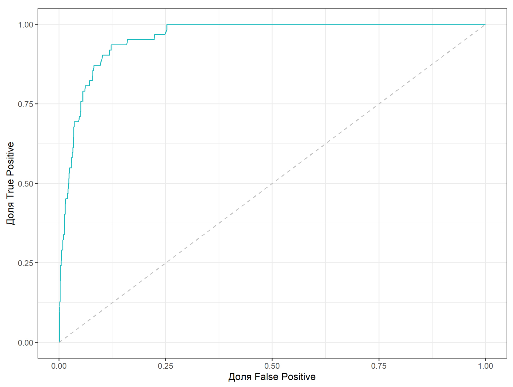 Последняя указанная мера – AUC – представлена так называемой площадью под кривой ошибок (англ. ROC-curve, Receiver Operating Characteristic curve), которая строится в координатах доли TP, являющихся значением recall, и доли FP (рис. 1). Ее оценка похожа на предыдущие тем, что чем эффективнее модель, тем ближе показатель AUC к единице (ста процентам), но при этом показатель метрики «0,5» (50 %) означает полное отсутствие предсказательной силы, случайное определение TP и FP с равной вероятностью. Также есть и другие способы оценки эффективности, также используемые в ряде случаев – F-мера (агрегированные вместе precision и recall, лучшее значение также стремится к единице), AUC под кривой precision-recall, логистическая функция потерь и другие.