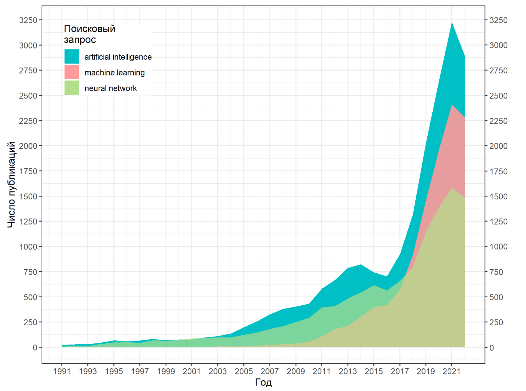 Рис. 2. Ежегодная динамика публикации работ по запросам ИИ, МО и НС в патологии, по данным PubMed.gov