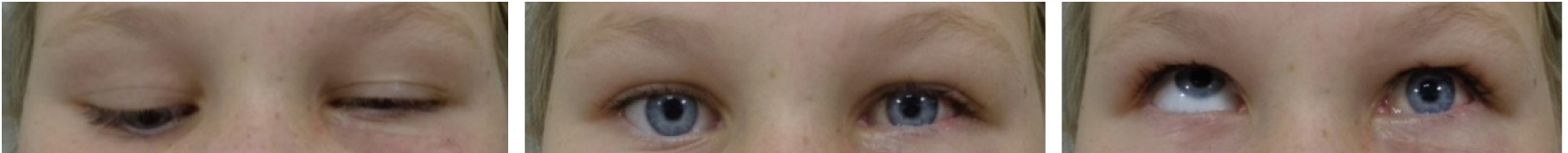 Клинический пример 1. Родители пациентки С. 10 лет обратились с жалобами на ограничение подвижности левого глаза вверх и двоение. Из анамнеза известно, что неделю назад девочка ударилась головой при падении. По данным компьютерной томографии (КТ), слева имеется трещина нижней стенки орбиты в средней трети шириной 2 мм. В зоне локализации перелома – дефект нижней прямой мышцы, предположительно разрыв, пролапс мягких тканей орбиты в верхне-челюстную пазуху до 9 мм. При объективном осмотре в первой позиции взора выявлена ортотропия и полное отсутствие подвижности левого глаза кверху (рис. 1). Пациентке поставлен диагноз: перелом нижней стенки орбиты, разрыв нижней прямой мышцы. Рекомендована ревизия зоны перелома и нижней прямой мышцы cito.