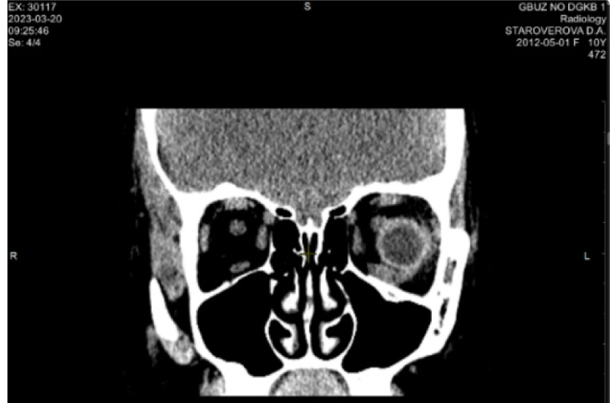 Рис. 9. Компьютерная томография орбит до операции. Клинический пример 3