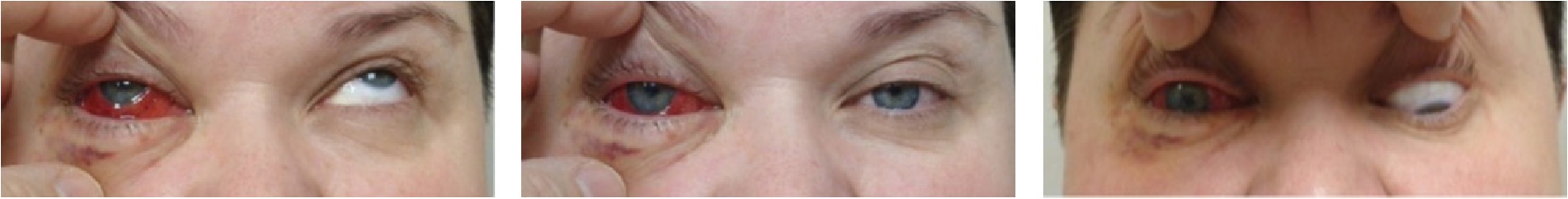 Во время операции при выделении зона перелома из трещины нижней орбитальной стенки извлечен обрывок нижней прямой мышцы. Область перелома перекрыта пластинкой политетрафторэтилена (ПТФЭ) толщиной 1 мм. Через разрез конъюнктивы нижнего свода выделен и прошит второй фрагмент мышцы. Далее оба фрагмента сопоставлены и сшиты. Через 3 недели после операции отмечено появление ограниченной подвижности левого глаза кверху и книзу (рис. 2).