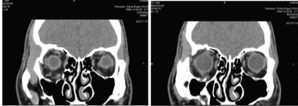 Рис. 6. Компьютерная томография орбит до операции. Клинический пример 2