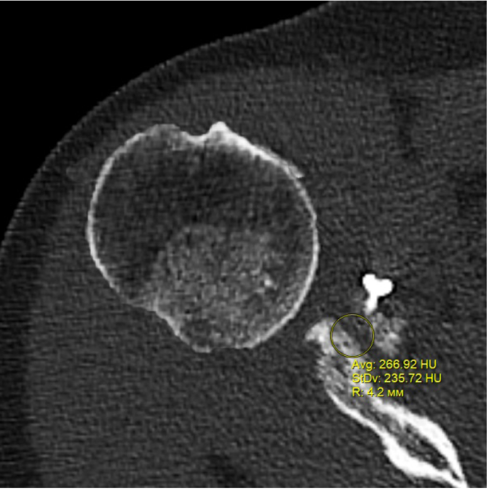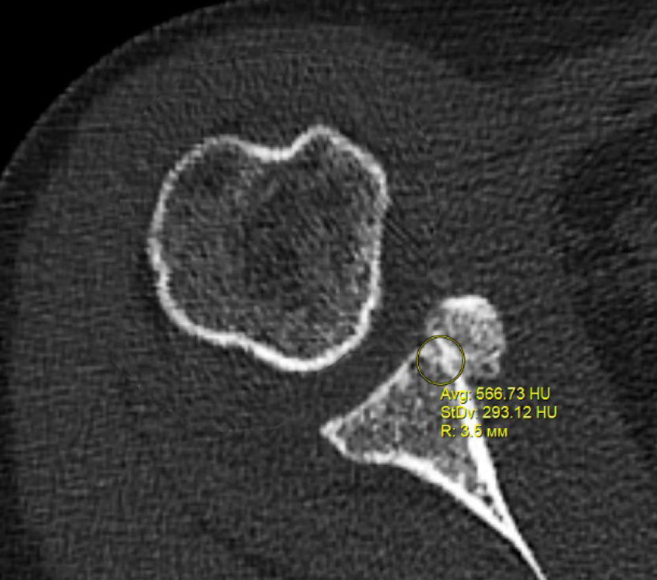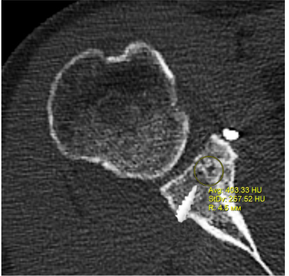 В программном обеспечении, на аксиальных КТ срезах оперированного плечевого сустава, выбирали инструмент «круг», который позволял посчитать среднюю плотность тканей внутри круга в единицах Хаунсфильда. Шкала единиц Хаунс-филда (HU) – шкалалинейного ослабления излучения по отношению к дистиллированной воде, рентгеновская плотность которой была принята за 0 HU (при стандартных давлении и температуре). Круг устанавливали таким образом, чтобы одна его половина была заполнена тканью гленоида, вторая половина тканью трансплантата (рис. 1–3). Оценивали плотность тканей над проксимальным винтом, между винтами, под дистальным винтом. Полученные данные анализировали с помощью пакета Microsoft Excel.