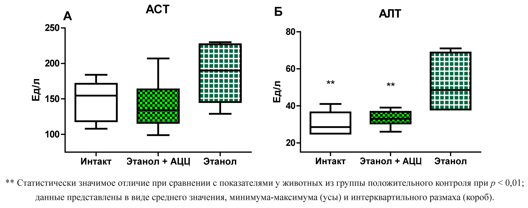 Введение ацетилцистеина после острого отравления этанолом благоприятно сказывалось на состоянии антиоксидантных систем печени (глутатион), активности перекисного окисления липидов (диеновых конъюгатов) и токсическом повреждении печени (АЛТ).