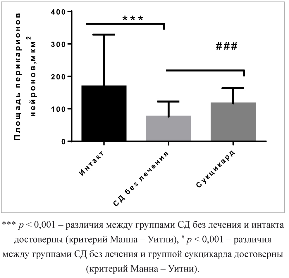 По данным нашего исследования в коре ГМ в группе животных с СД при фармакологической коррекции сукцикардом наиболее выраженные признаки повреждения нейронов обнаружены в наружном зернистом и наружном пирамидном слоях первичной соматосенсорной коры. При этом в группе животных с СД при фармакологической коррекции сукцикардом изменения вышеуказанных абсолютных и относительных показателей были менее выражены по сравнению с группой СД без лечения, что свидетельствует о частичном восстановлении структурных характеристик нейронов и нейропиля в коре ГМ.