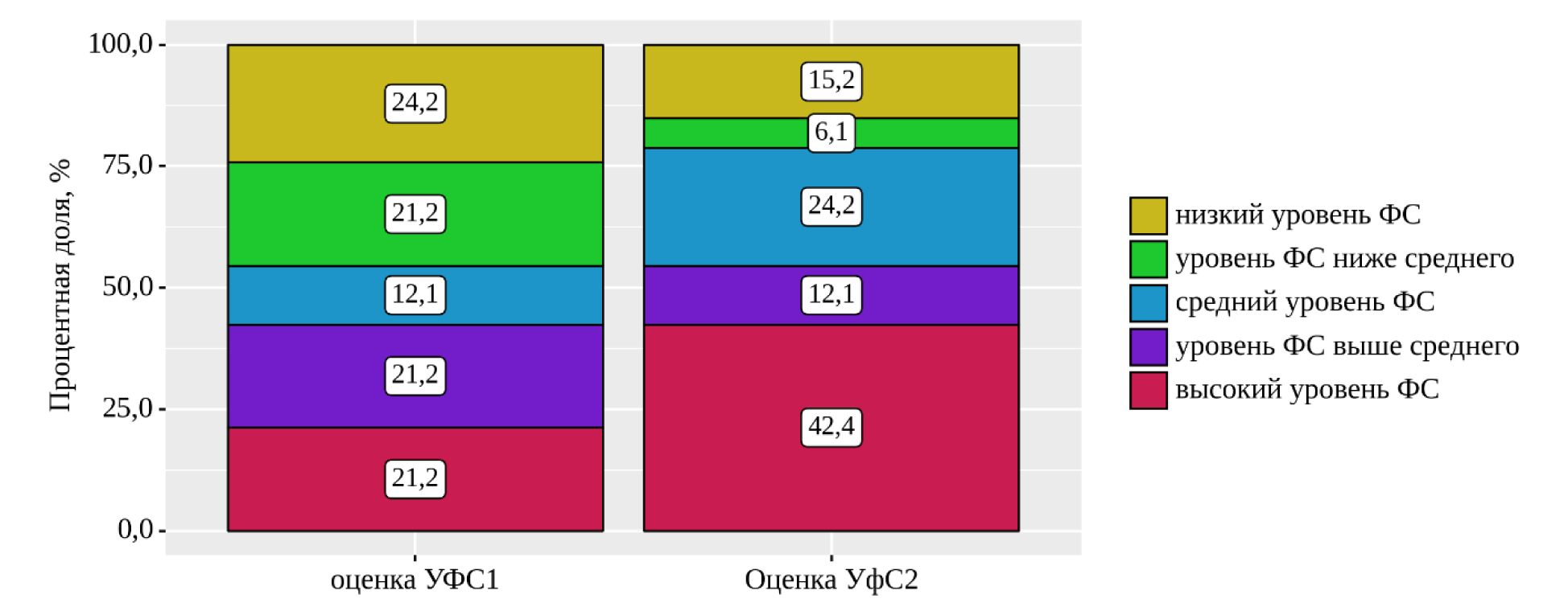 Количество респондентов с высоким уровнем физического состояния изменилось с 21,2 до 42,4 %, значительно уменьшился процент людей с низким УФС, с 24,2 до 15,2 % и УФС ниже среднего, с 21,2 до 6,1 % соответственно. Количество людей со средним уровнем физического состояния также изменился с 12,1 до 24,2 % (рис. 2.)