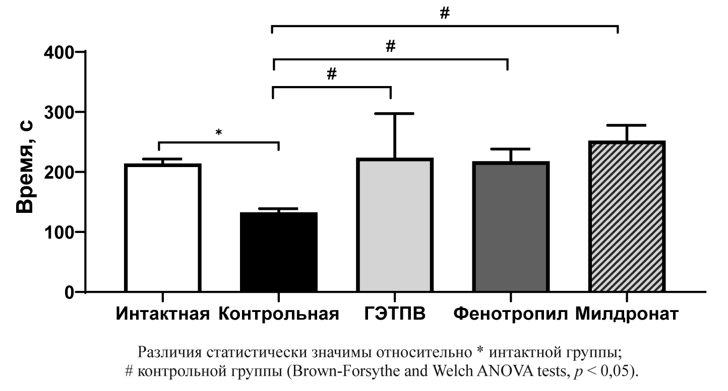 В тесте «Вынужденное плавание с грузом» тенденция сохранялась, и самки контрольной группы плавали в 1,6 раза (p < 0,05) меньше по сравнению с интактными крысами. Животные, которым вводили ГЭТПВ, фенотропил и милдронат, плавали в 1,7; 1,6 и 1,9 раза дольше относительно группы после ХАИ, получавшей физраствор (рис. 3).