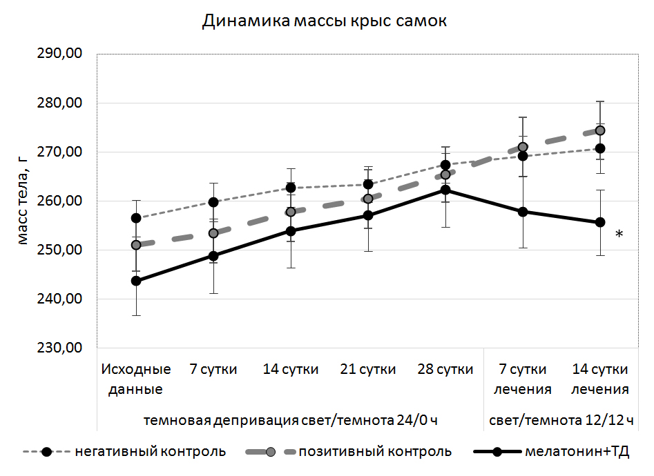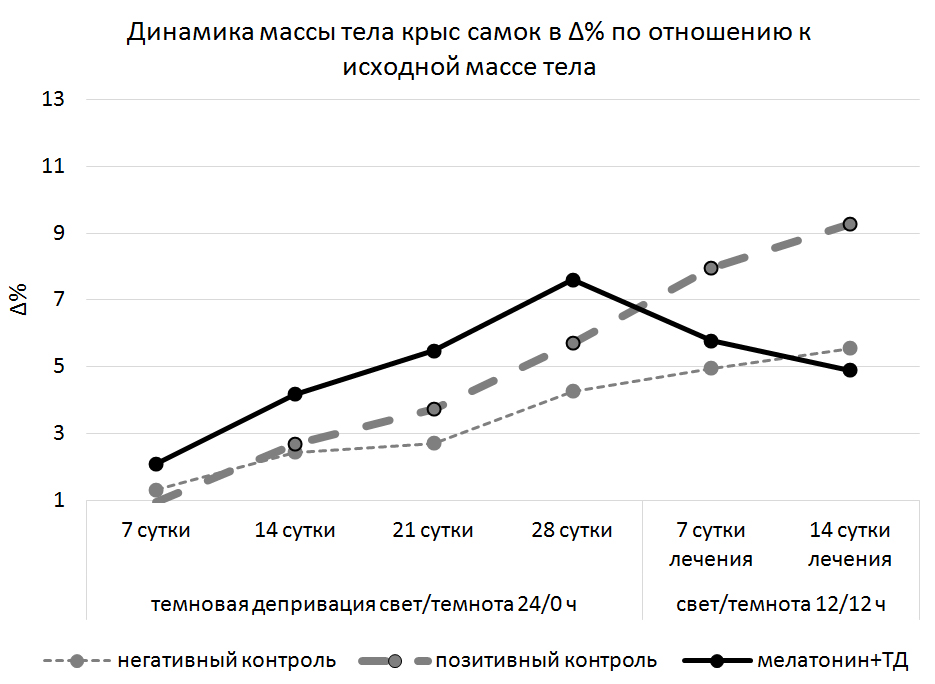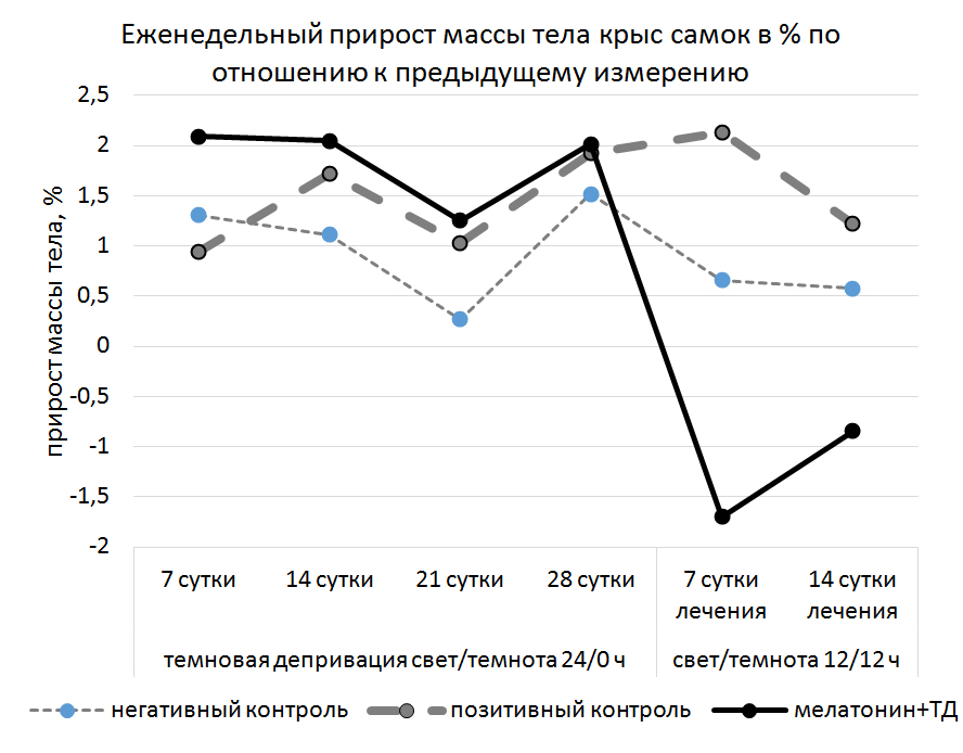 На 21-е сут. эксперимента у животных на фоне темновой депривации выявлено снижение темпа прироста массы тела (1,02 и 1,25 %, группы позитивного контроля и опытная соответственно) по сравнению с показателем крыс из группы негативного контроля, однако различия не были статистически значимыми. По окончании темновой депривации на 28-е сутки темп прироста массы тела у крыс группы позитивного контроля и опытной составил 1,92 и 2,02 % соответственно. На фоне приема мелатонина на 7-е сутки после окончания темновой депривации темп прироста массы тела животных опытной группы приобрел отрицательные значения и составил 1,7 %, на 14-е сут. – 0,85%; также было выявлено снижение массы тела на 1,7 и 2,5% на 7 и 14 сут. соответственно.