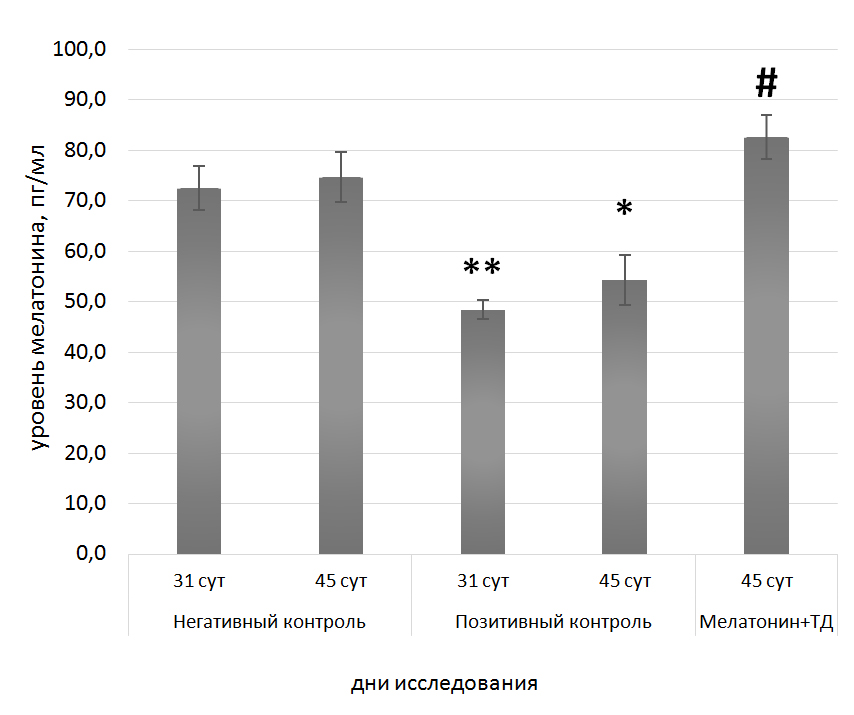 У животных из группы позитивного контроля уровень мелатонина был статистически значимо меньше, чем показатели крыс из группы негативного контроля на 31-е сутки – на 30,9 %, на 45-е сутки – на 27,2 % (рис. 4). У крыс опытной группы уровень мелатонина в крови был выше, чем показатель животных позитивного контроля на 64,9 %.