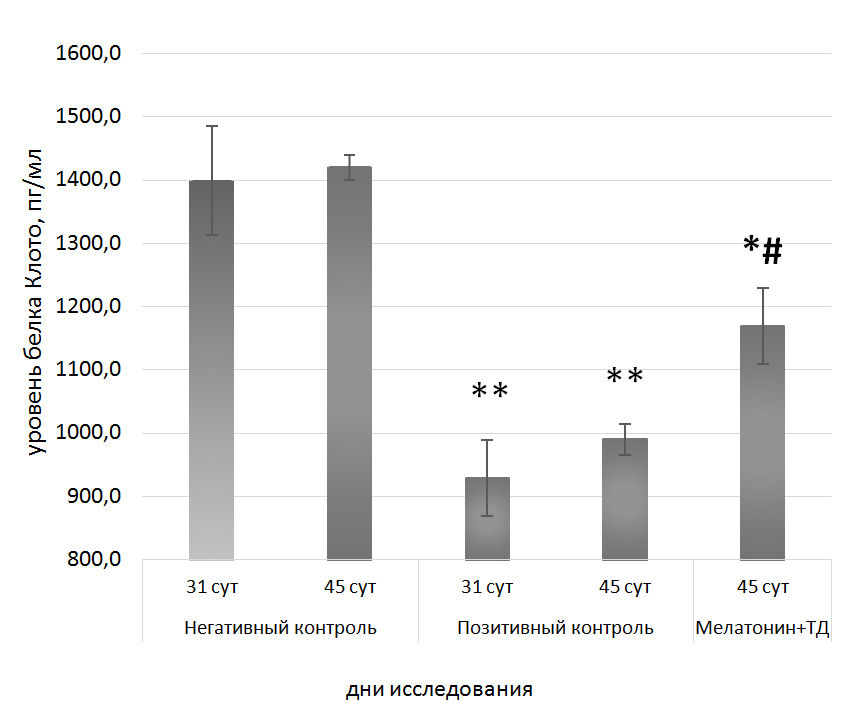 Темновая депривация в течение 30 суток сопровождалась статистически значимым снижением уровня белка Клото в крови животных группы позитивного контроля – в 1,5 раза по отношению к аналогичному показателю группы негативного контроля. Через 14 суток после отмены темновой депривации у крыс данной группы отмечалось увеличение уровня белка Клото в сыворотке крови в 1,07 раза по сравнению с предыдущим измерением показателя, однако не достигал уровня группы негативного контроля. Повышение уровня белка Клото у животных позитивного контроля через 14 суток после окончания темновой депривации указывает на тенденцию к частичной компенсации нарушений, вызванных световым десинхронозом. У животных в опытной группе, получавших после отмены темновой депривации 14-дневным курсом экзогенный мелатонин, уровень белка Клото был выше, по сравнению с показателем животных позитивного контроля (рис. 5).
