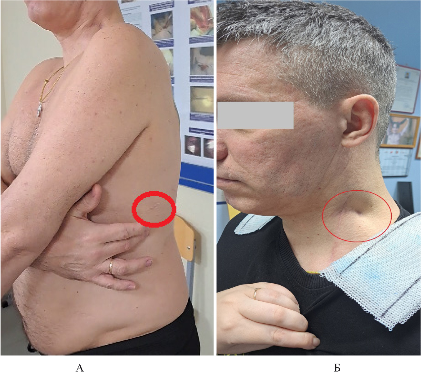Рис. 1. Рубцы в области шеи пациента на месте входного (А) и выходного (Б) отверстий огнестрельного осколочного ранения