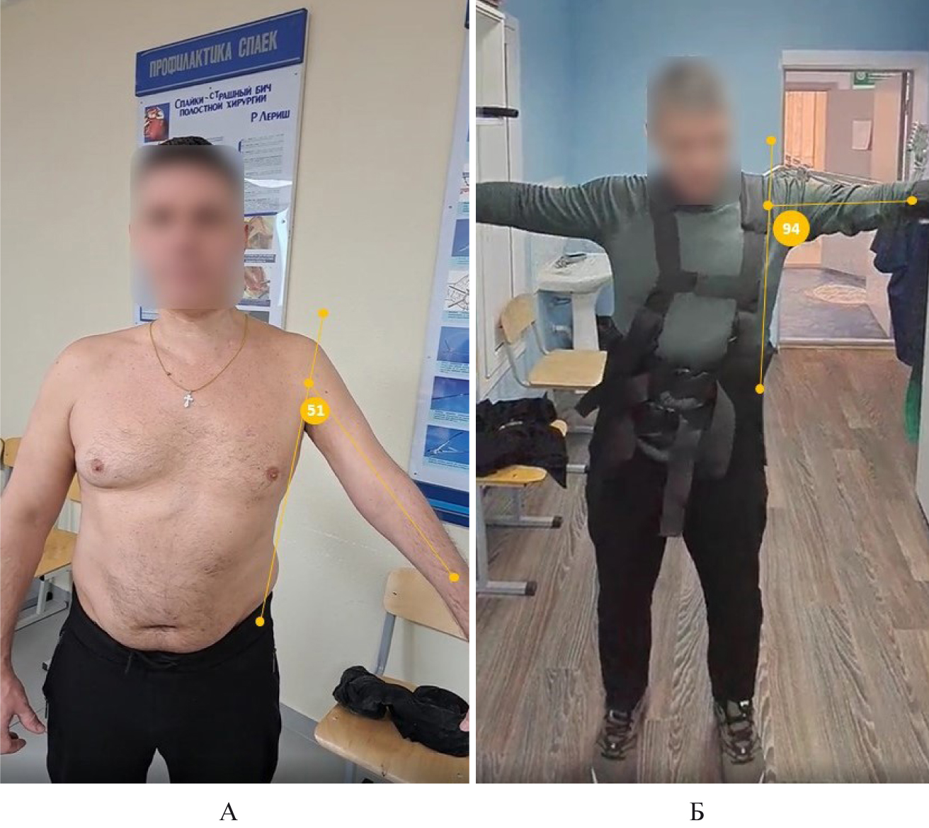 Рис. 2. Отведение в плечевом суставе до (А) и во время (Б) примерки пассивного экзоскелета «ЭКЗАР-34»