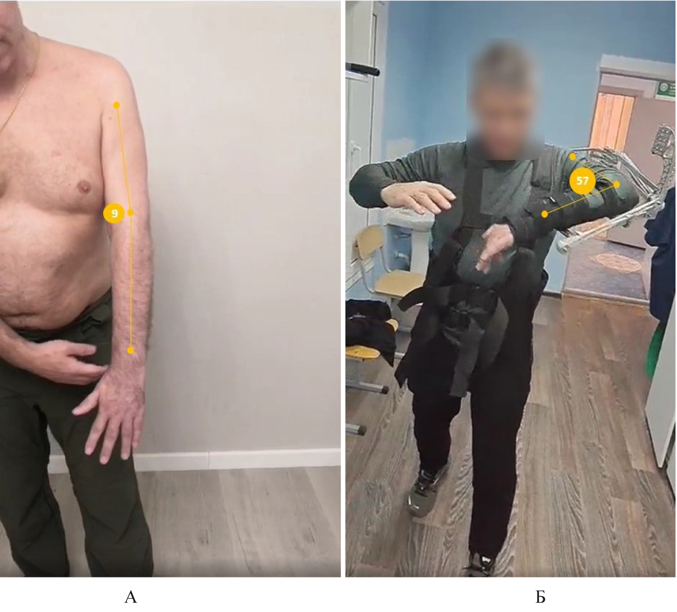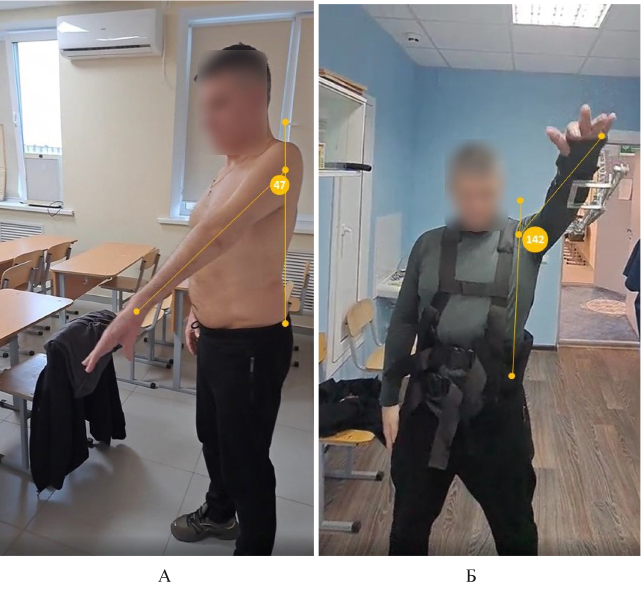 Рис. 3. Сгибание в плечевом суставе до (А) и во время (Б) примерки пассивного экзоскелета «ЭКЗАР-34»
