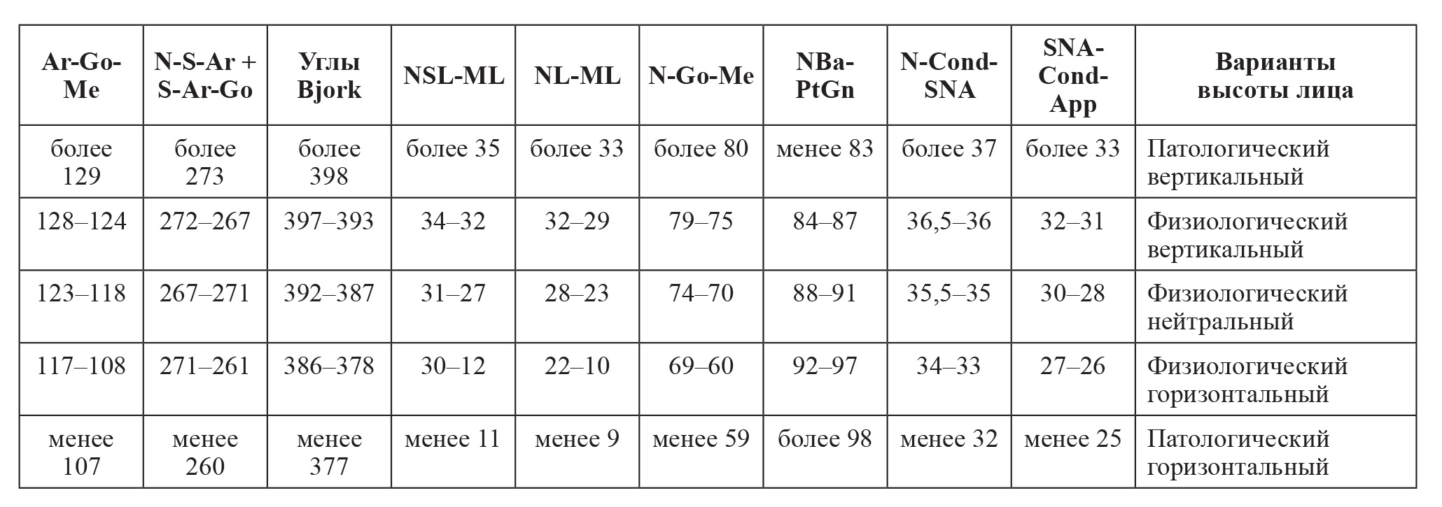 Основу анализа традиционно составляла суммарная составляющая трех углов Bjork, которая включала углы N-S-Ar, S-Ar-Go и Ar-Go-Me, которые ограничивают костные структуры линевого отдела головы, и полученная величина определяет типологические особенности роста лица. Нижний нижнечелюстной угол образован линиями N-Go и Go-Me. При построении лицевого угла Ricketts проводили линию N-Ba и линию Pt-Gn, с последующим измерением внутреннего угла.