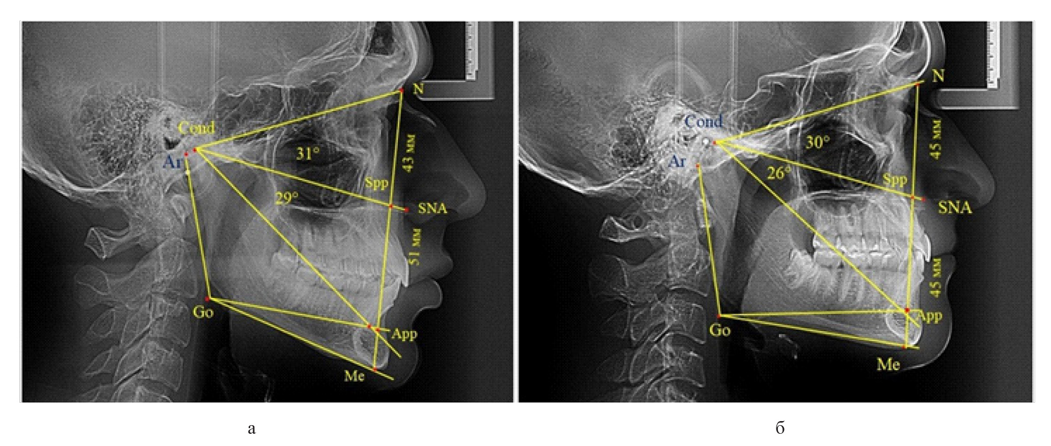 Рис. 5. Варианты ТРГ с оптимальными размерами носового отдела и оптимальными (а) и укороченными (б) размерами гнатической части лица