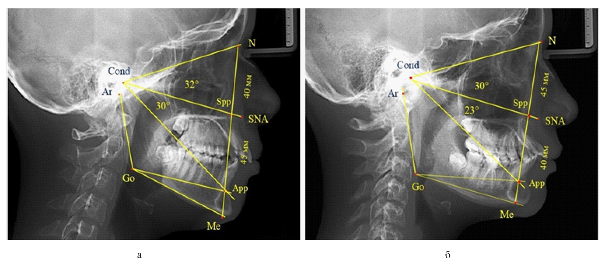 Рис. 6. Варианты ТРГ с уменьшенными размерами носового отдела и оптимальными (а) и укороченными (б) размерами гнатической части лица при глубокой резцовой окклюзии