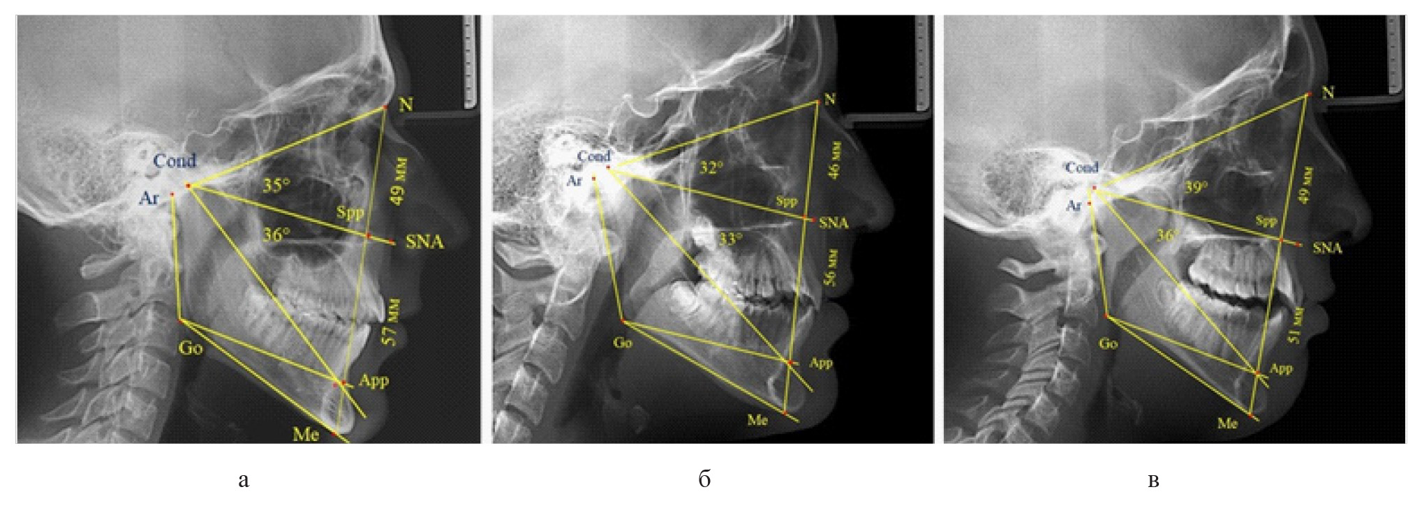 Рис. 3. Сравнительный анализ ТРГ с оптимальными размерами носового отдела и оптимальными (а), укороченными физиологическими (б) и увеличенными физиологическими (в) размерами гнатической части лица