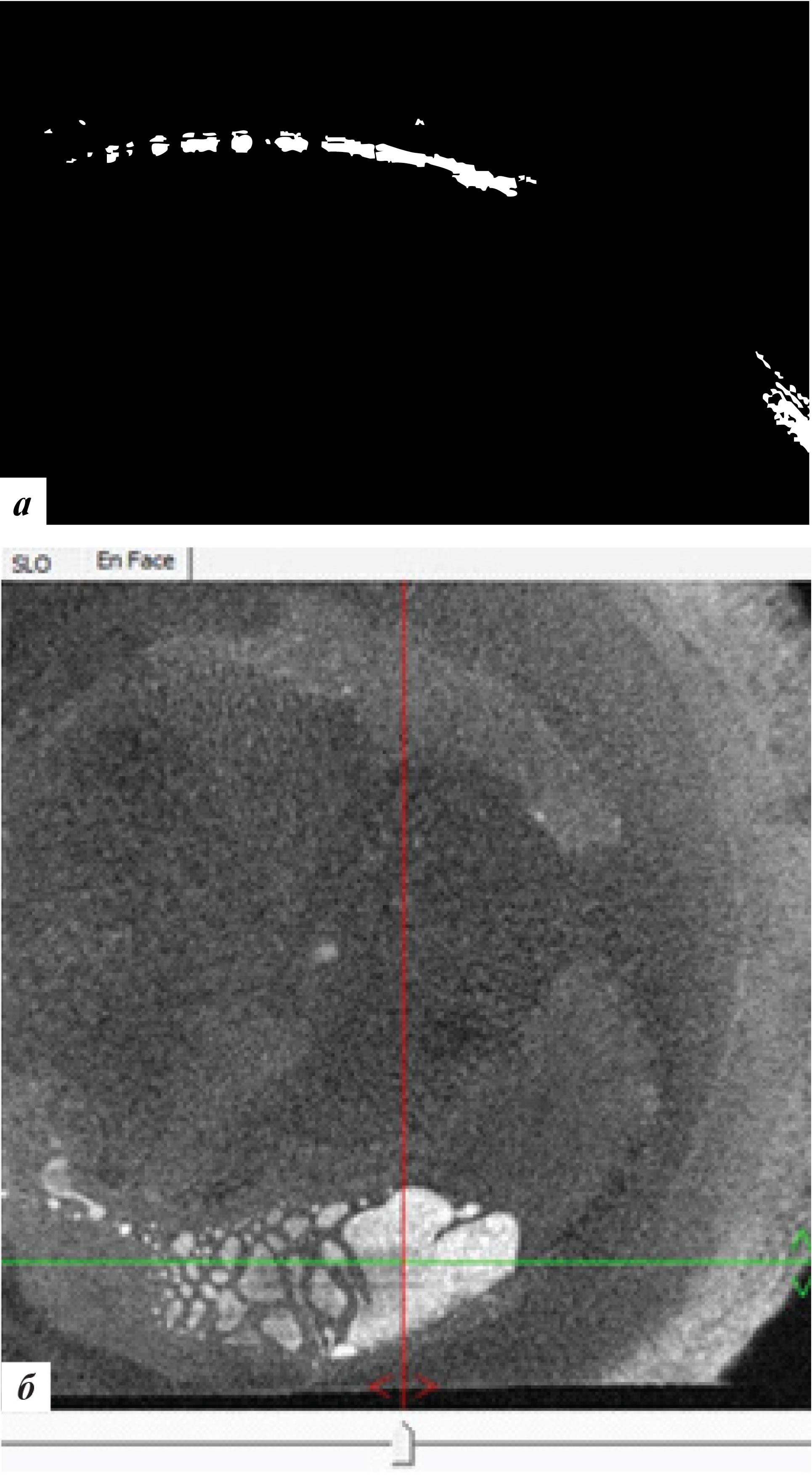 Рис. 7. Данные ОКТ роговицы левого глаза через 3 месяца после лечения: а – горизонтальная проекция, б – фронтальная проекция