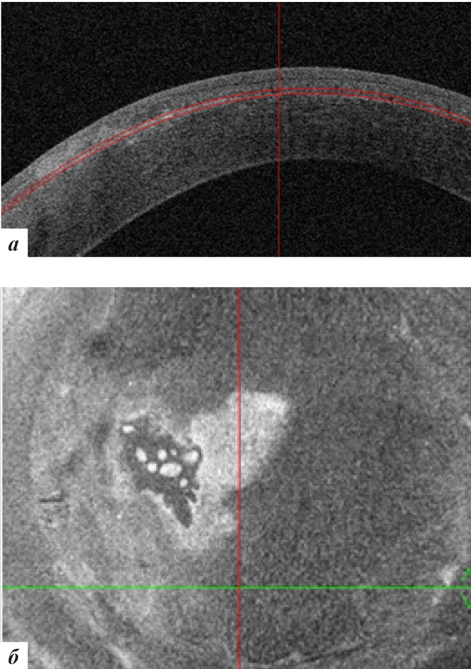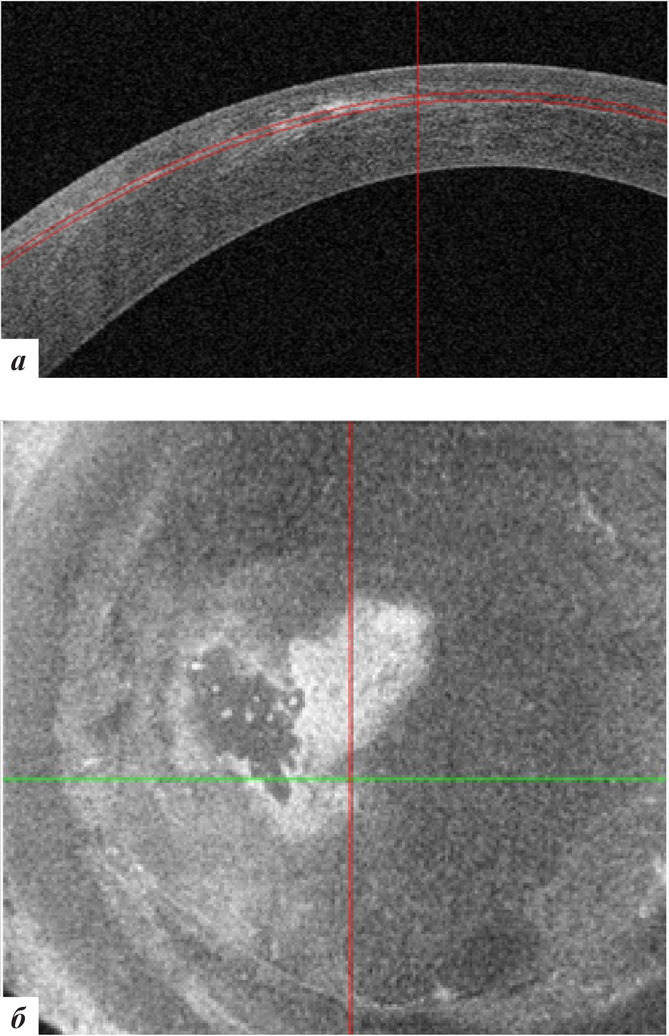 Рис. 11. Данные ОКТ роговицы левого глаза через 18 месяцев после лечения: а – горизонтальная проекция, б – фронтальная проекция