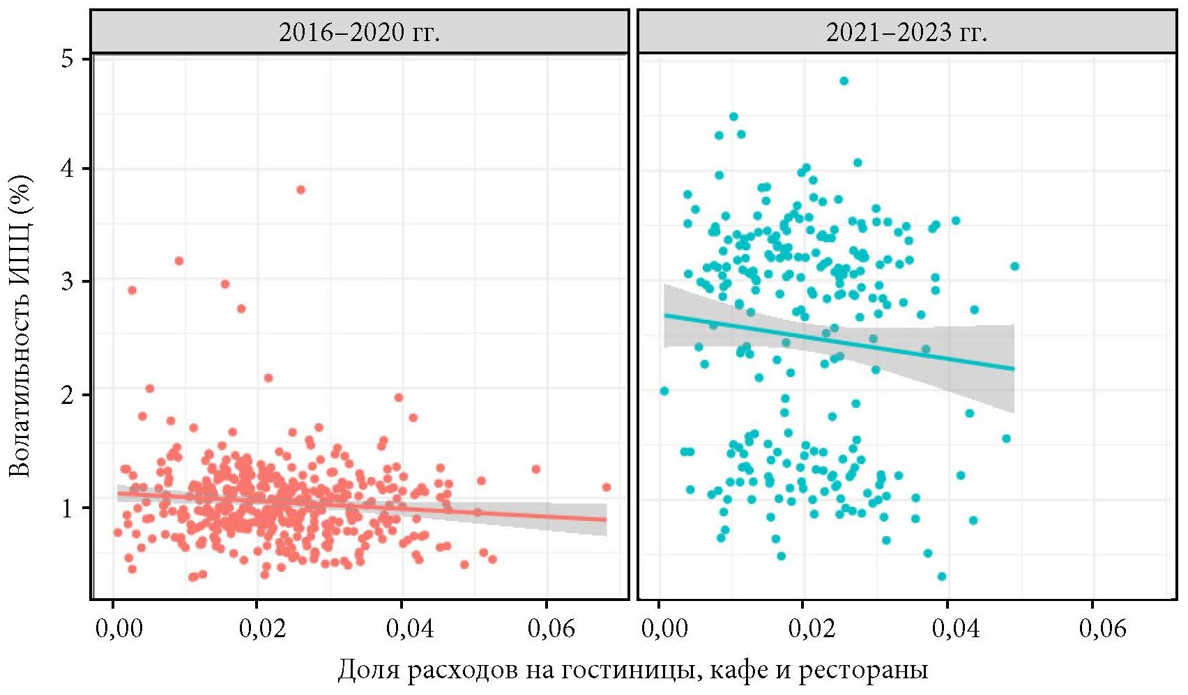 Вместе с тем с 2021 г. связь между волатильностью ИПЦ и долей расходов на отдых стала более явной, чем ранее: подтверждением этому является изменение угла наклона кривой в период с 2021 по 2023 г. на рис. 9.