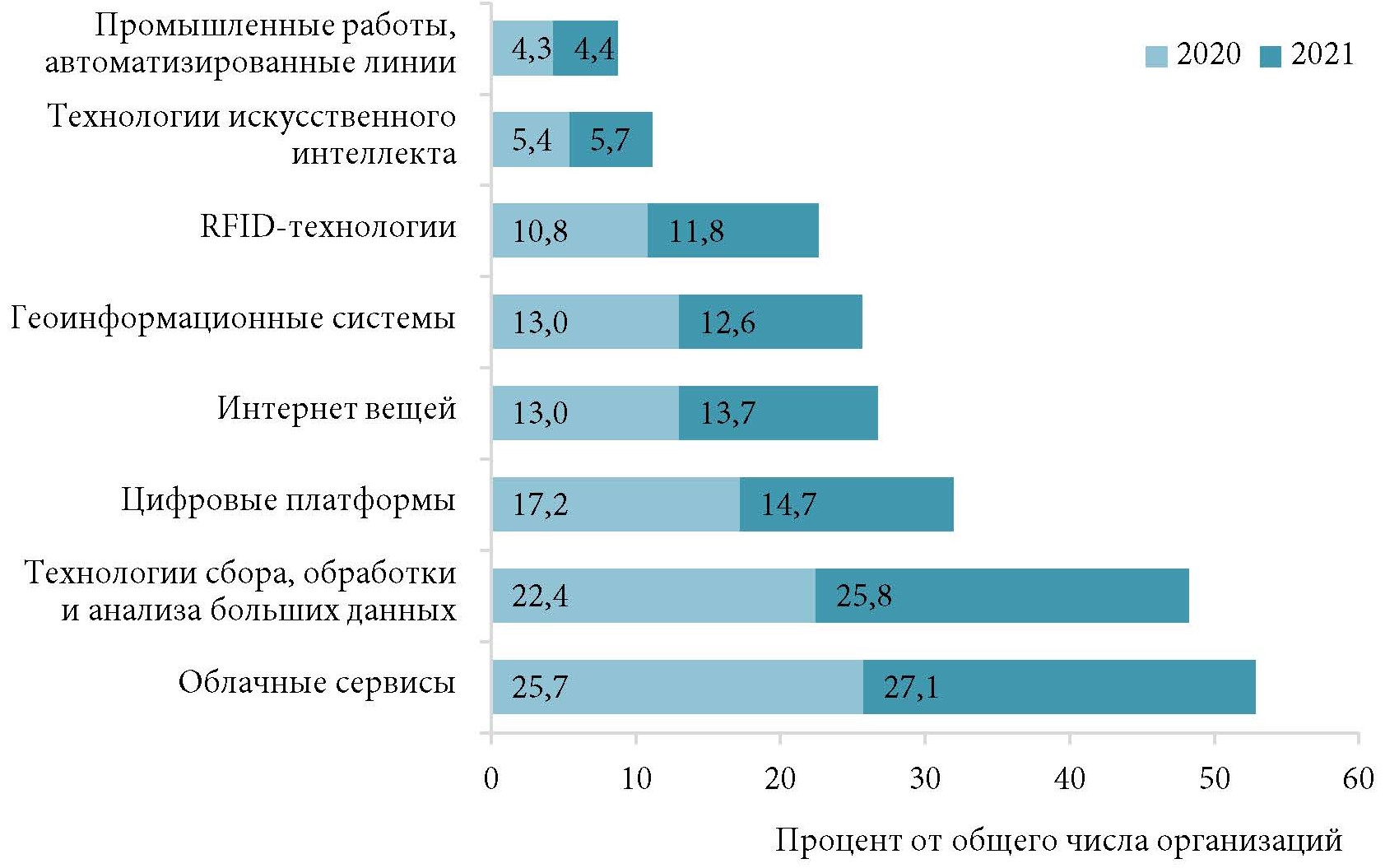 6 Индекс цифровизации бизнеса рассчитывается на основе следующих показателей: уровень использования широкополосного интернета, облачных сервисов, RFID-технологий, ERP-систем и включенность в электронную торговлю.