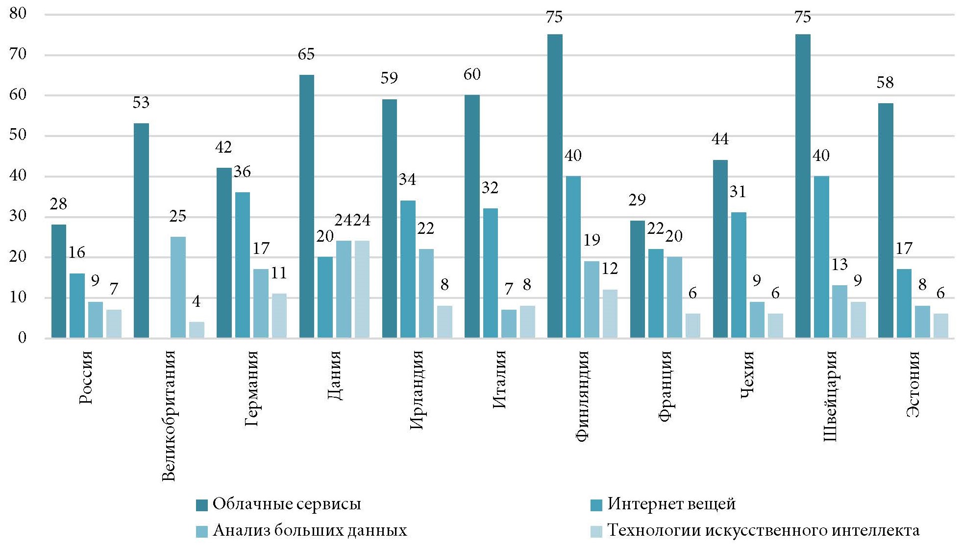 Использовались данные в территориальном разрезе: в межстрановом контексте рассматривалось применение цифровых технологий в организациях; на уровне отдельной страны (России) характеризовалось использование средств защиты информации, программных средств в организациях; на региональном уровне (на примере отдельных субъектов Северо-Западного федерального округа, далее – СЗФО) рассмотрены приоритетные отрасли и сквозные технологии для внедрения в отраслях экономики и социальной сфере, представлены кейсы, касающиеся цифровизации различных направлений деятельности.