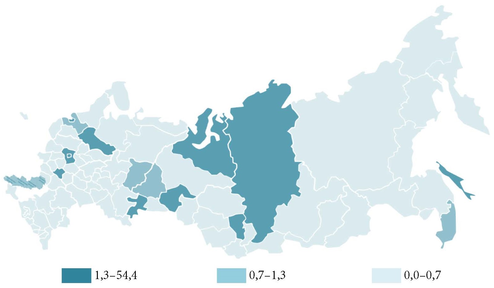 Средние | Краснодарский край, Ярославская область, Свердловская область, Липецкая область, Нижегородская область, Пермский край, Челябинская область, Кемеровская область, Амурская область, Самарская область, Чукотский автономный округ, Томская область, Ростовская область, Республика Саха (Якутия), Воронежская область, Удмуртская Республика, Владимирская область, Тульская область, Республика Башкортостан, Приморский край, Калужская область, Новосибирская область, Оренбургская область, Республика Коми | Вологодская область, Краснодарский край, Свердловская область, Республика Татарстан, | Кемеровская область, Ленинградская область, Приморский край, Свердловская область |