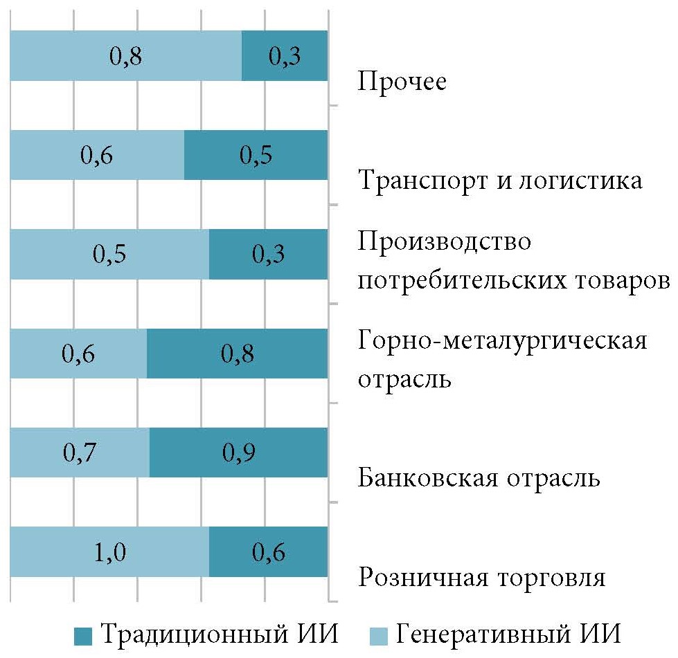 Очевидно, что более высокий эффект от внедрения традиционного искусственного интеллекта (машинное обучение, глубокое обучение и продвинутая аналитика) достигается в отраслях, где огромное количество задач связано с обработкой большого массива данных, а именно в ИТ-отрасли и банковском секторе. Следует отметить, что от генеративного ИИ получается более сглаженный эффект: основная часть задач, решаемая посредством использования генеративного ИИ, по крайней мере в текущих условиях, носит скорее функциональный характер, а не относится к конкретной отрасли. Так, на семь отраслейкономики Российской Федерации приходится 70 % потенциала ИИ. Среди указанных отраслей можно выделить транспорт, логистику, ретейл, банкинг, производство потребительских товаров, добывающую промышленность, ИТ-отрасль.