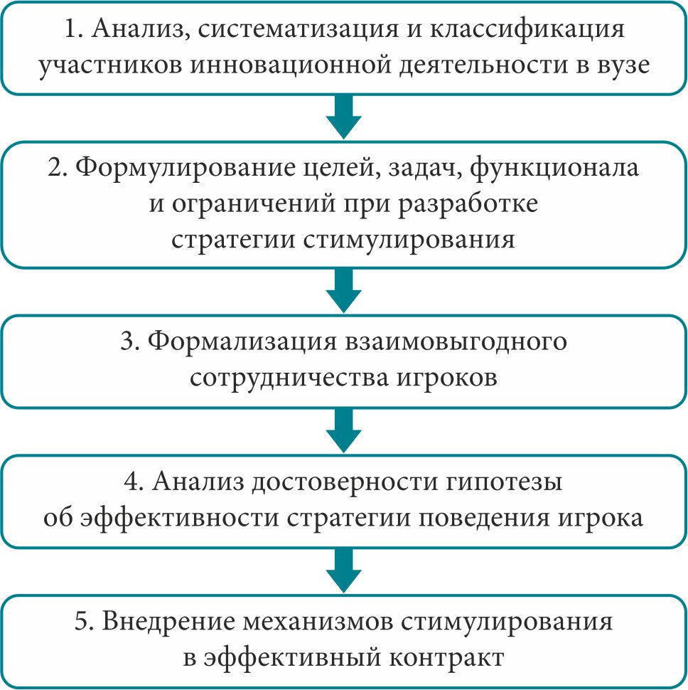Теория игр предоставляет инструменты для анализа различных моделей стимулирования. Рассмотрим поэтапную технологию применения аппарата теории игр для стимулирования преподавателей через эффективный контракт (рис. 1). Д. А. Новиков считает, что «последовательное прохождение пяти этапов позволяет на основе формализации деятельности каждого из игроков проверить предполагаемую гипотезу об эффективности выстроенной игровой стратегии» [21].