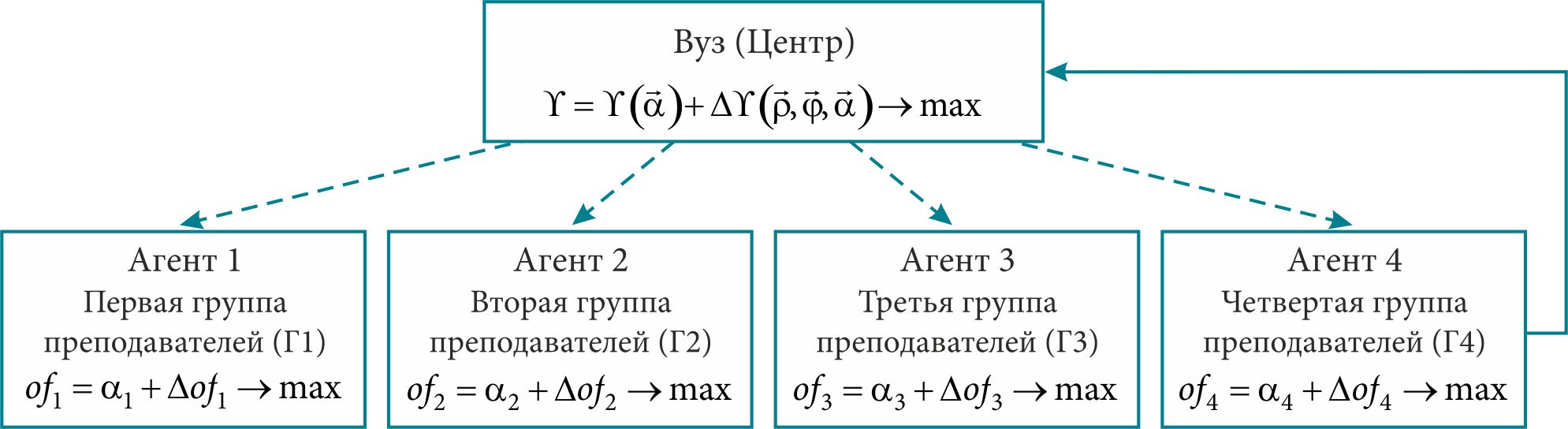В процессе подготовки научной публикации были использованы результаты реализованного в вузе проекта. Деятельность администрации вуза была определена как деятельность Центра. Четыре выявленные группы преподавателей (Г1–Г4) рассматривались в проекте как Агенты. Учитывались интересы Центра и каждой группы Агентов отдельно. В проекте Центром инициирован план, который обеспечивает ему максимум выгоды.