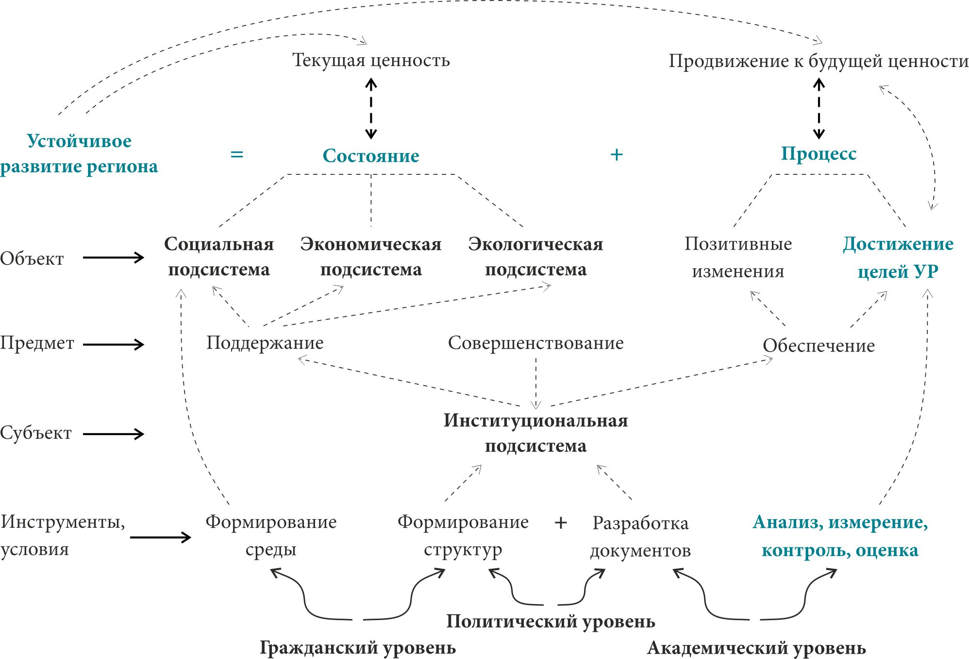 Таким образом, предлагаемый подход к обеспечению устойчивого развития региона, помимо согласованности целей региональной политики с национальными целями и ЦУР, а также их согласованности по горизонтали, должен предусматривать объединение ценностного и процессного подходов за счет введения в модель институциональной подсистемы. Это поможет примирить дуалистический характер понятия устойчивого развития (рис. 1).
