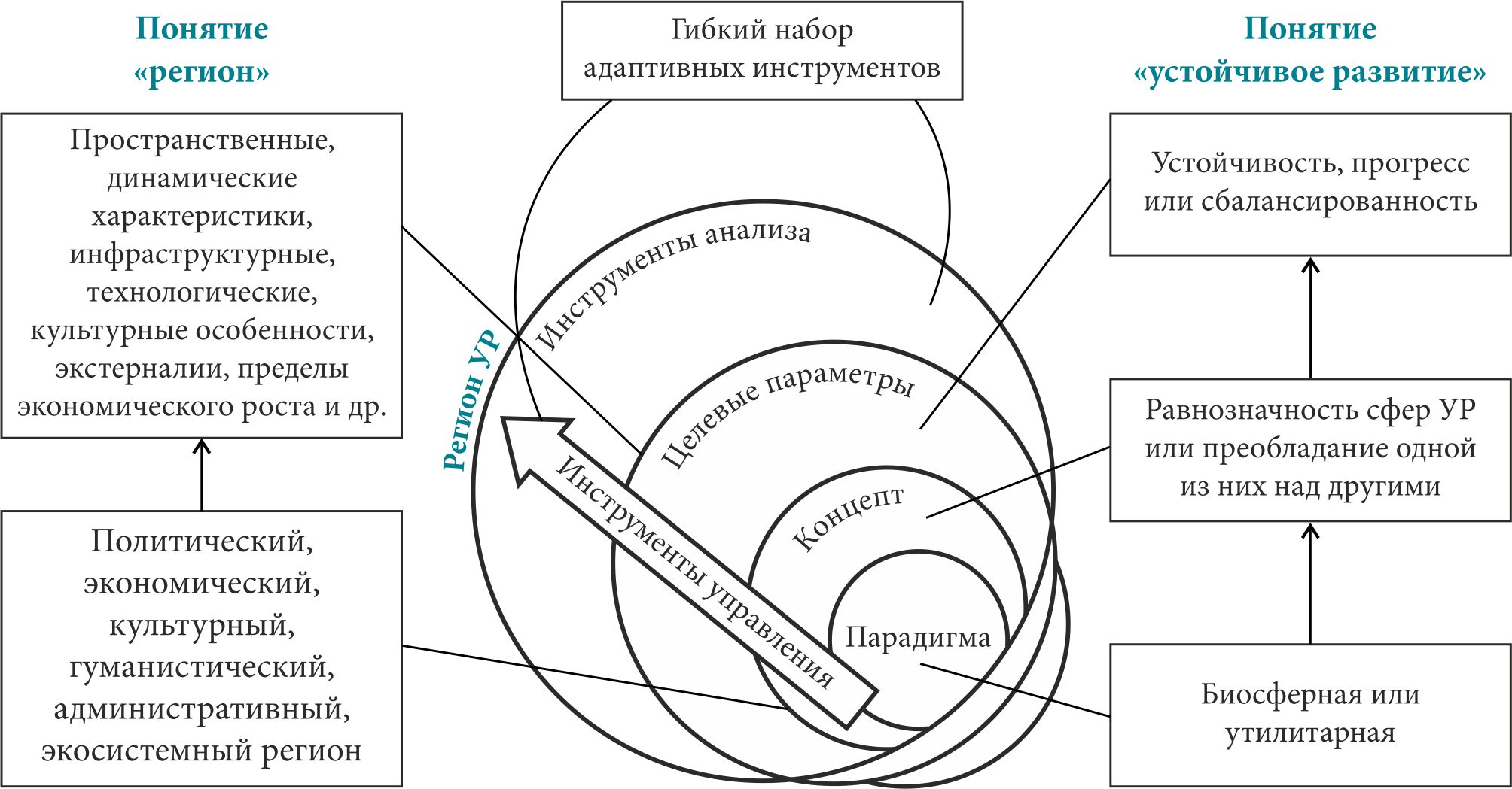 Разработка стратегии устойчивого развития региона должна, по нашему мнению, начинаться с формирования концептуальной модели, поскольку прежде всего необходима концептуальная ясность в определении существенных аспектов устойчивого развития, которые должны быть отражены в региональной политике. От этого зависят и принципы, и механизмы управления, а также их согласование или рассогласованность. В опубликованной ранее работе [14] нами рассмотрены основные концептуальные модели устойчивого развития, встречающиеся в современных научных и прикладных исследованиях. Все они могут быть разделены по парадигмальному основанию на два подхода: модели, сформулированные в рамках антропоцентрической парадигмы, и модели, опирающиеся на биосфероцентрическую парадигму. Вследствие этого интеграция ЦУР в парадигмальный контекст является весьма актуальной задачей для субнационального (регионального) уровня управления.