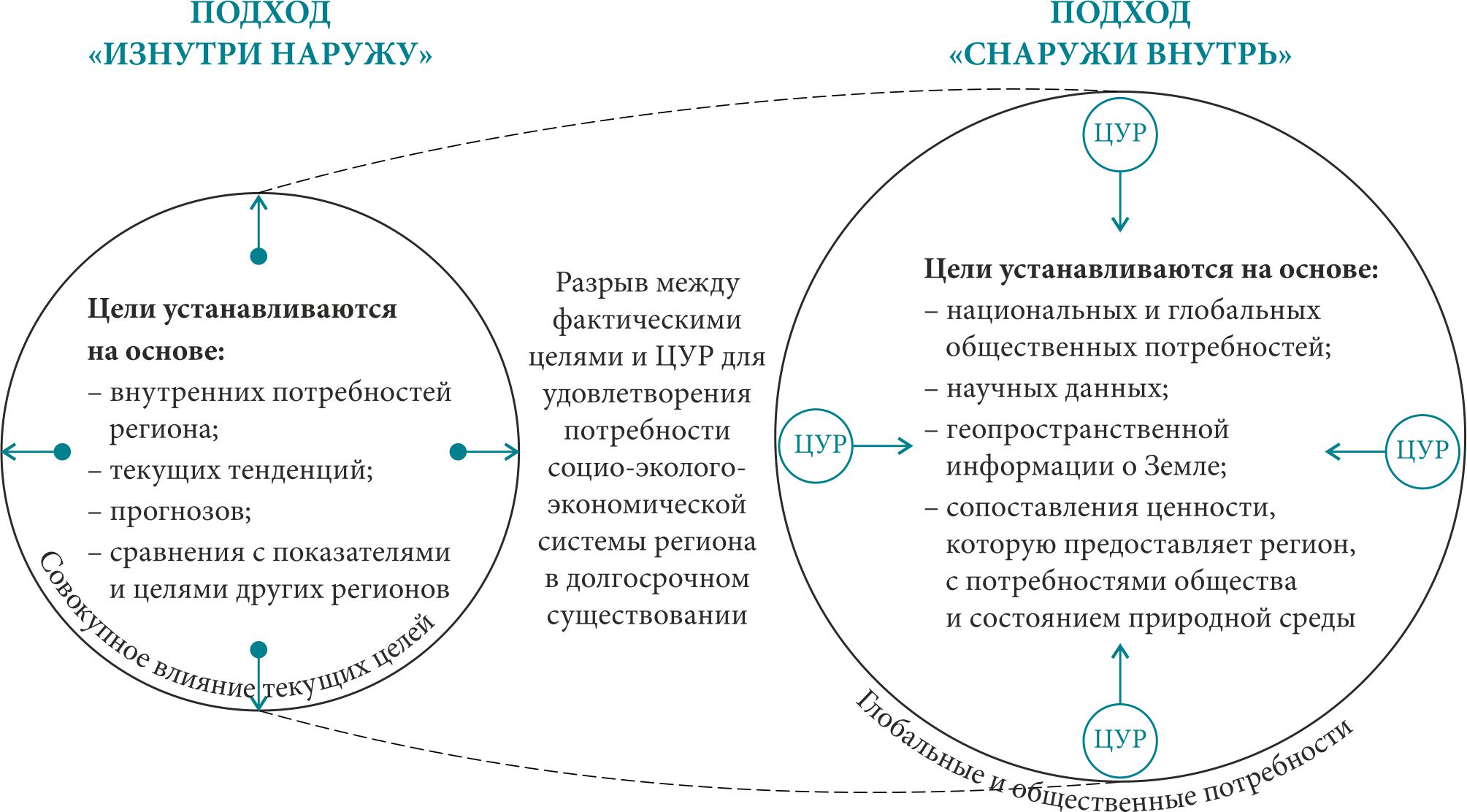 Между тем уже разработанного подхода к постановке целей, ориентированного на внутренние потребности региона, недостаточно, особенно в рамках биосфероцентрического подхода. Чтобы преодолеть данный разрыв, при планировании региональных программ устойчивого развития необходимо анализировать долгосрочные потребности с глобальной точки зрения. Пониманию данного принципа постановки целей способствует подход, изложенный в Руководстве по действиям бизнеса в отношении ЦУР7. Его адаптация к уровню региона представлена на рис. 4.