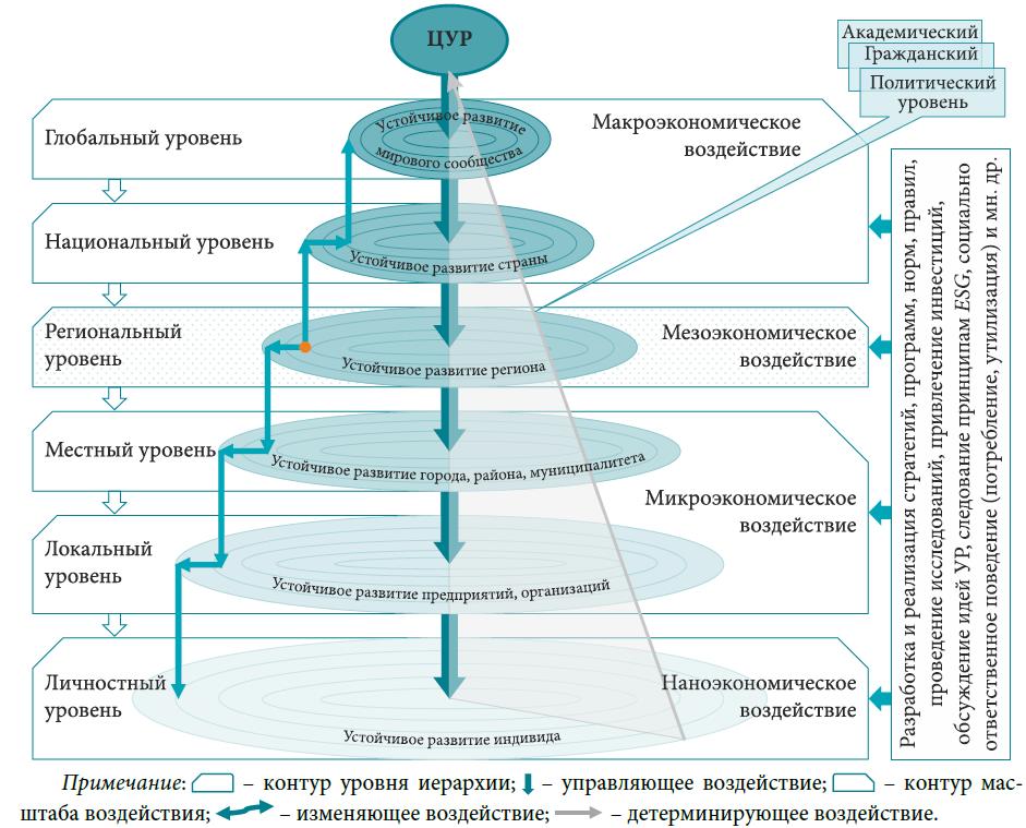 Примечание: ⍃ – контур уровня иерархии; ⬇ – управляющее воздействие; ⍄ – контур масштаба воздействия; ☇ – изменяющее воздействие; ↑ – детерминирующее воздействие.