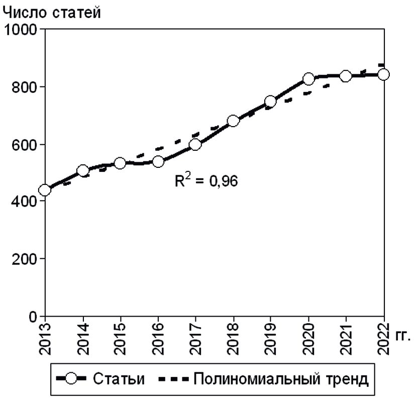 Поисковый режим в базе данных PubMed составил поисковое словосочетание: Rotator Cuff Injuries, период: с 2013 по 2022 г. (рис. 1, п. 1, 2). Поисковый режим позволил найти 5444 отклика на статьи по травмам вращательной манжеты плеча (см. рис. 1, п. 3). Динамика числа публикаций по годам представлена на рис. 2. Полиномиальный тренд при очень высоком коэффициенте детерминации демонстрировал увеличение данных. Среднегодовой показатель статей составил (653 ± 48).