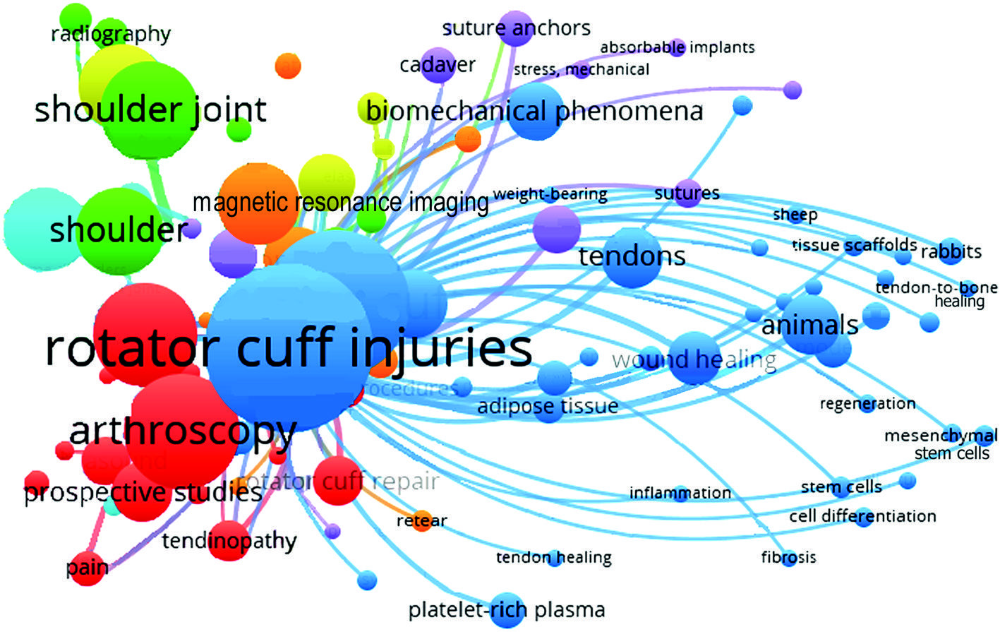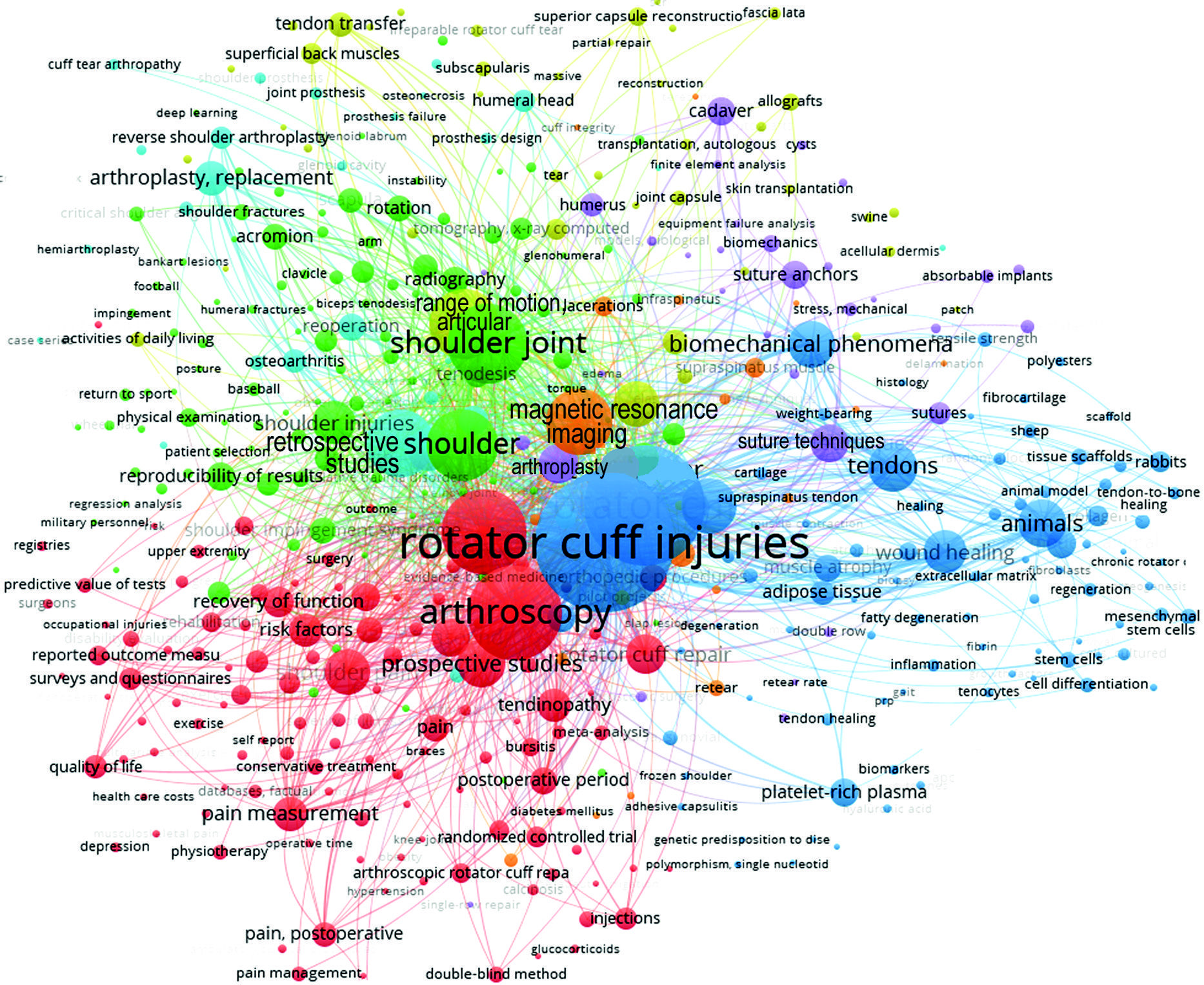 Methods. The study analyzes publications related to rotator cuff injures published from 2013 to 2022 and selected from the PubMed international reference and bibliographic database for ‘Rotator Cuff Injuries’ search query. A total of 5,444 results were retrieved and relevant bibliographic information was uploaded in “.txt” format into the analytical software VOSviewer 1.6.20.