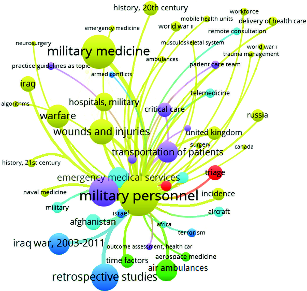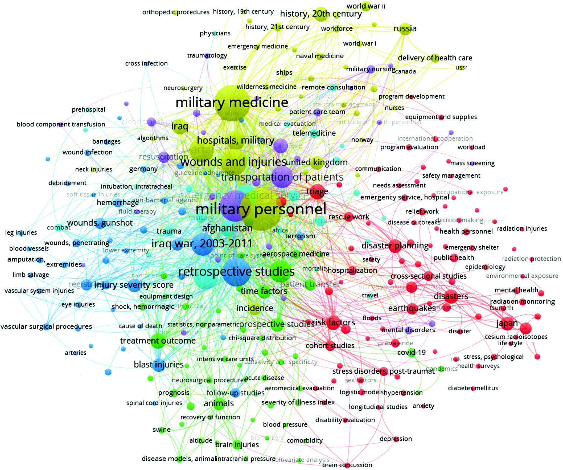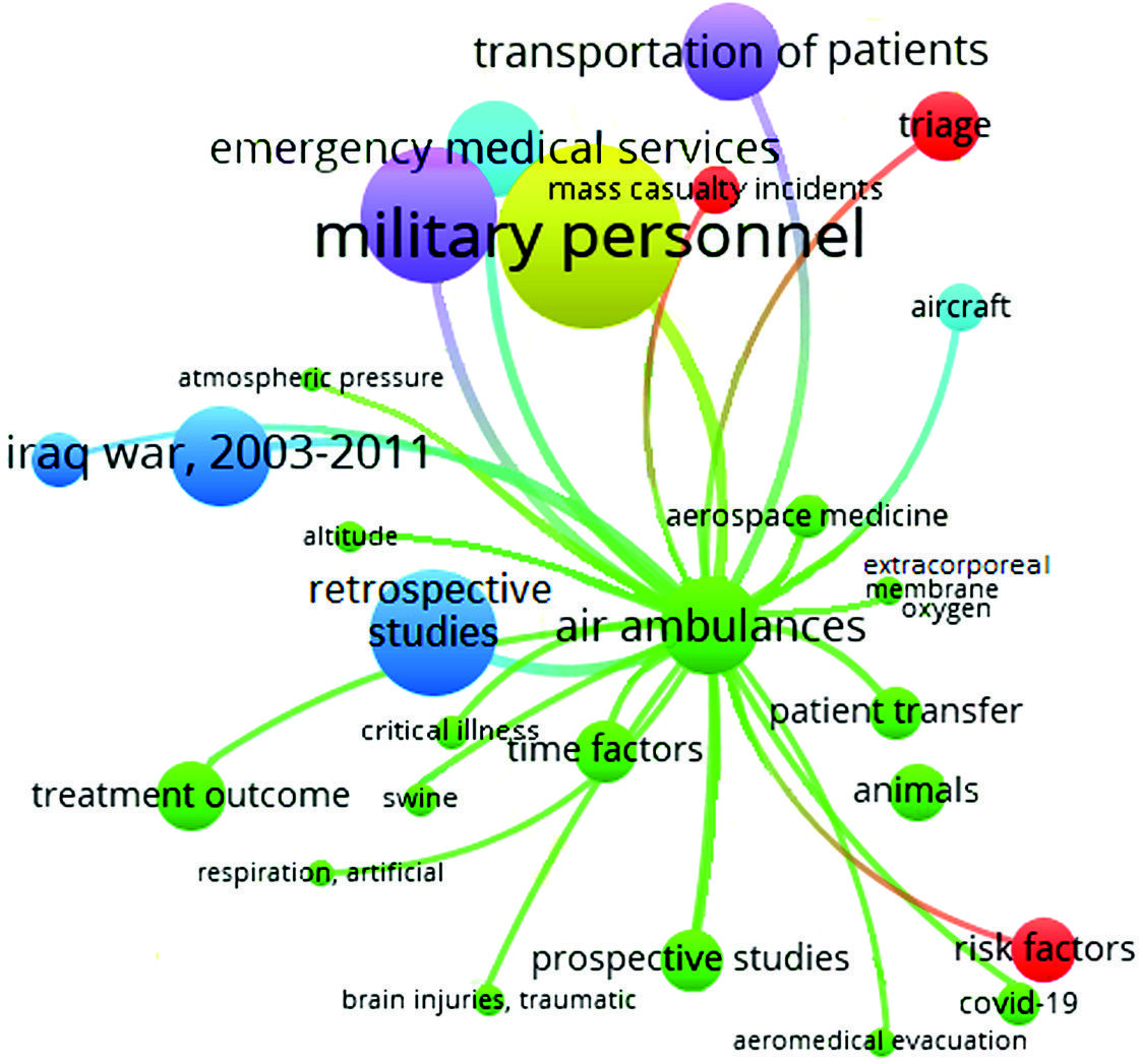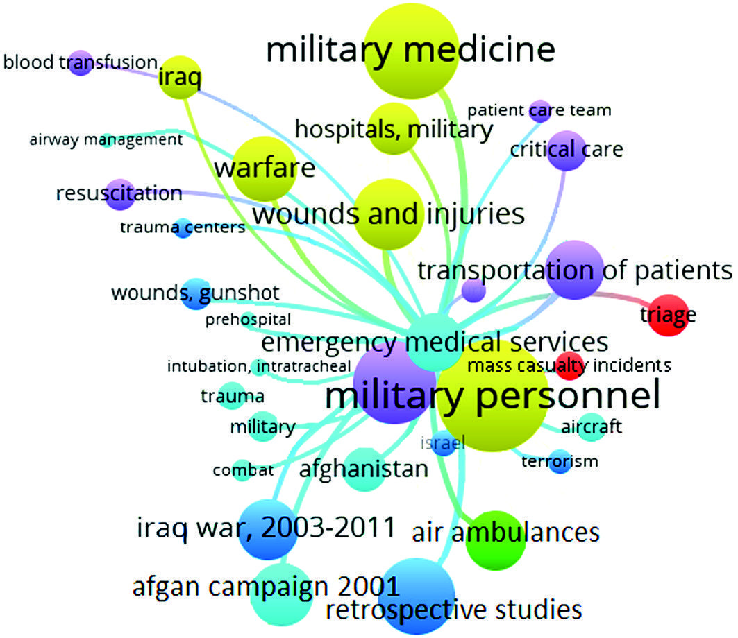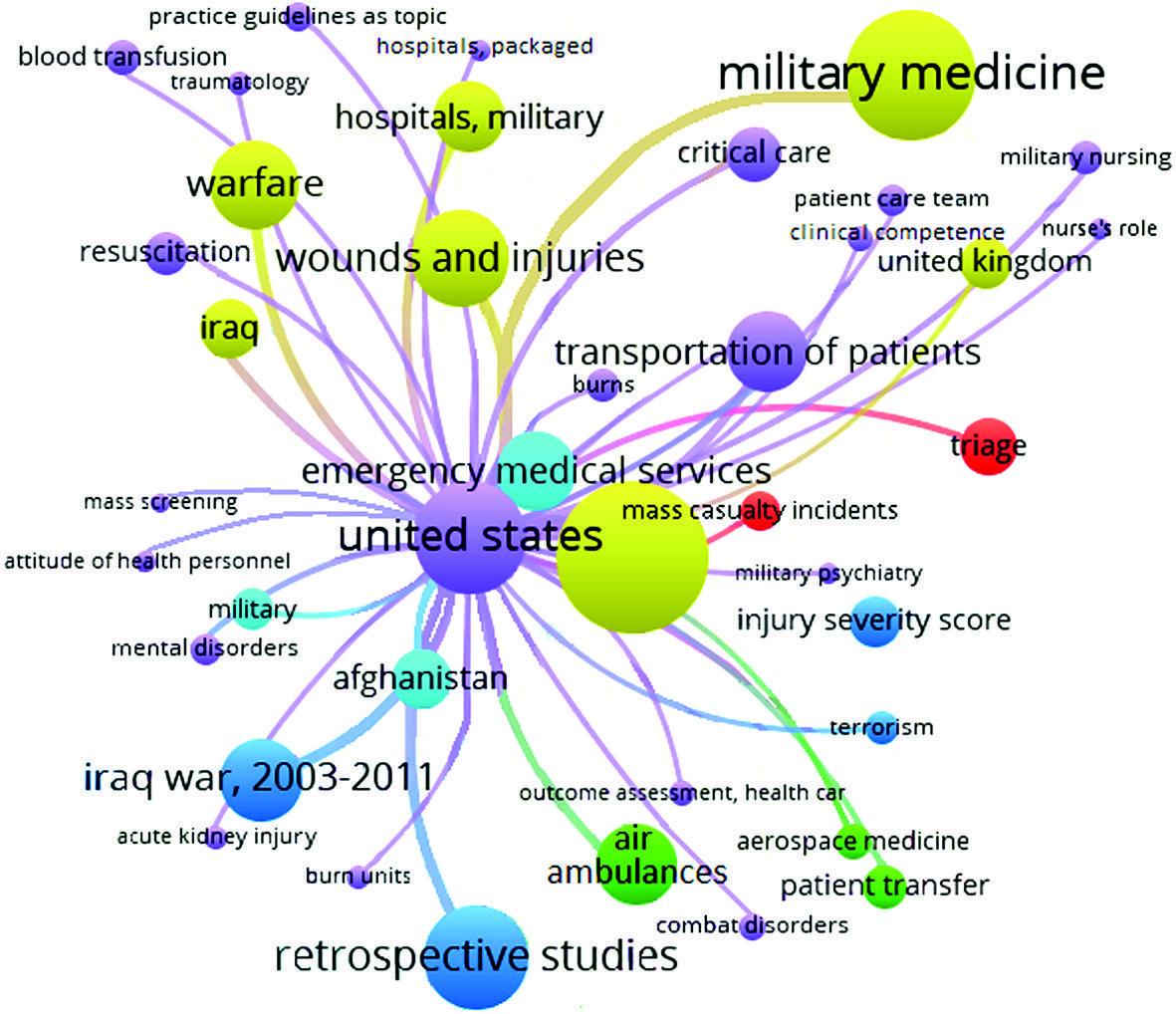 Methods. The study analyzes 1.496 international research papers dealing with medical aid and evacuation support management in military forces across the world. All the papers are published in peer-reviewed journals and registered in the PubMed database. The VOSviewer program was used for cluster analysis and visualization of keyword co-occurrences.