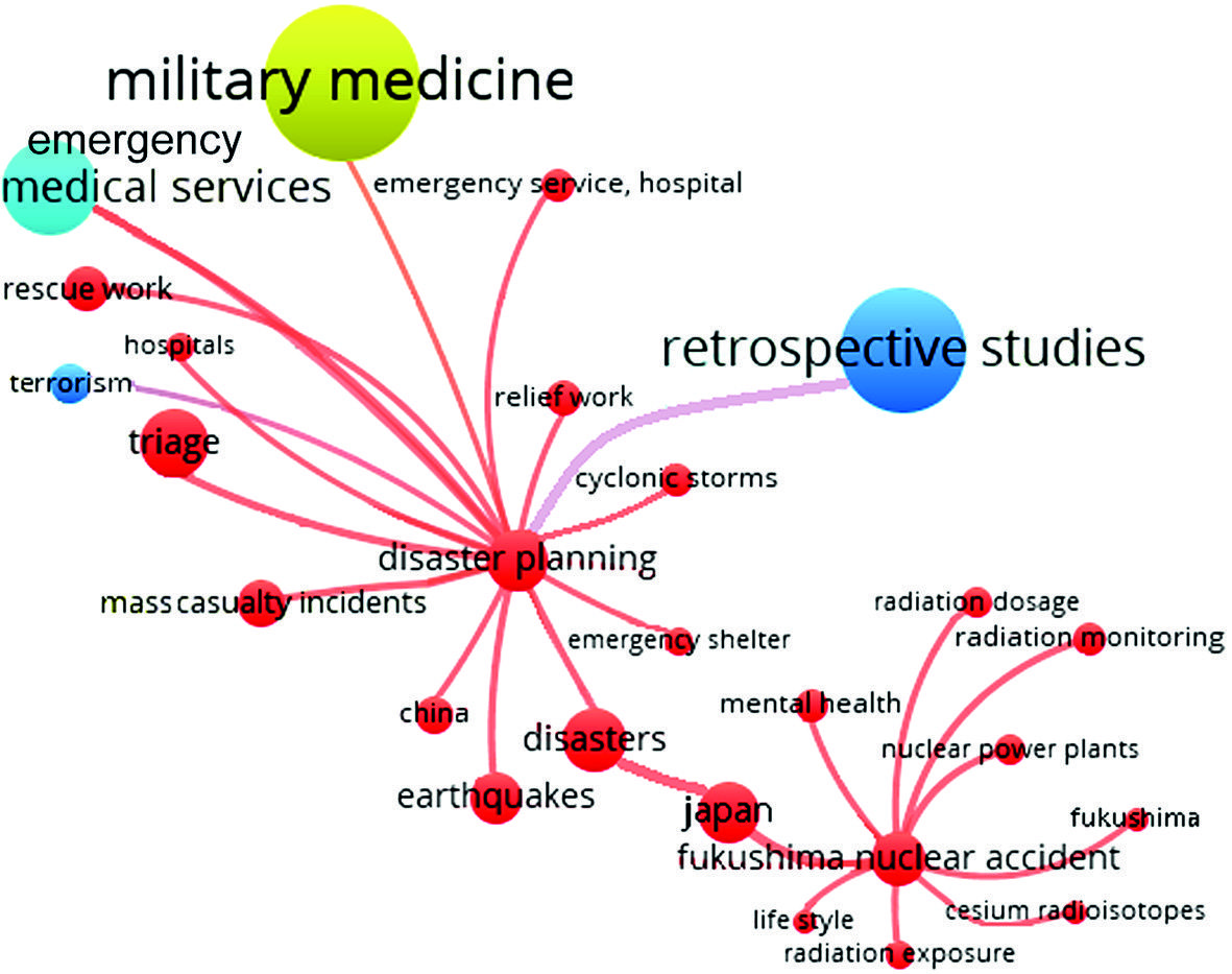 Во 2-й кластер «Лечебно-эвакуационные мероприятия при чрезвычайных ситуациях» вошли 57 ключевых слова, которые встречались в 19,8 % публикаций с общей силой связи 18,9 % (рис. 7). В статьях данного кластера ученые рассматривали широкий спектр вопросов, связанных с катастрофами, рисками возникновения чрезвычайных ситуаций и мероприятиями по ликвидации их последствий. Изучались вопросы, связанные с системой медицинской сортировки, эвакуации и госпитализации пострадавших во время чрезвычайных ситуаций. Данное обстоятельство определяется регулярным участием специалистов медицинской службы США в различных гуманитарных миссиях, что позволяет им поддерживать высокие профессиональные навыки в мирное время.