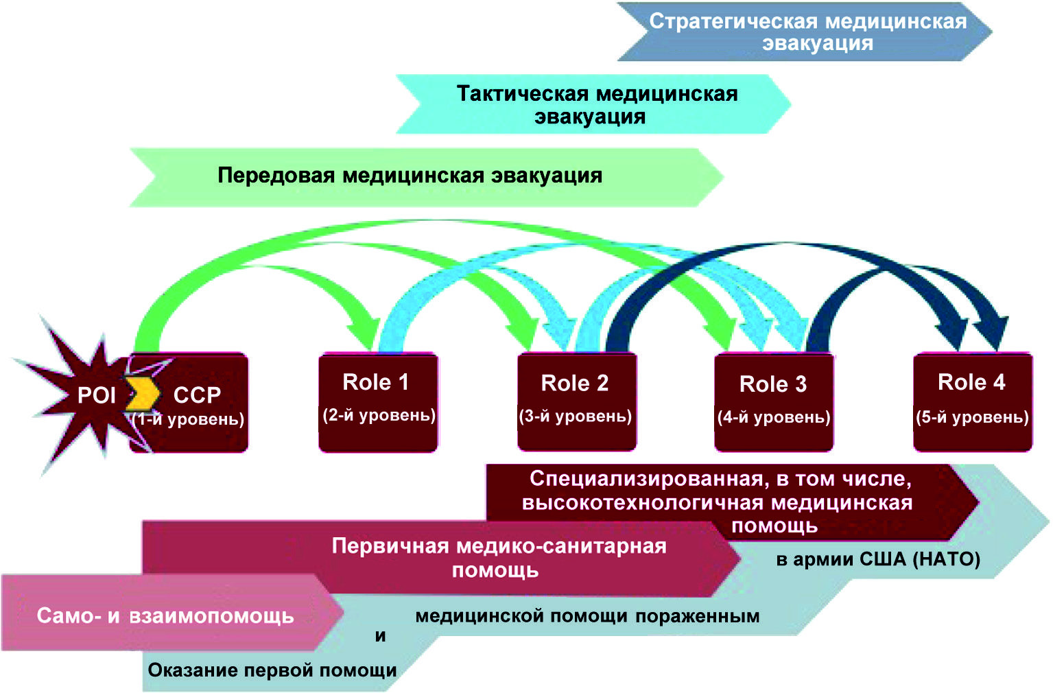 Рис. 11. Система оказания непрерывной медицинской помощи пораженным в армии США и стран НАТО (адаптировано по [5]).