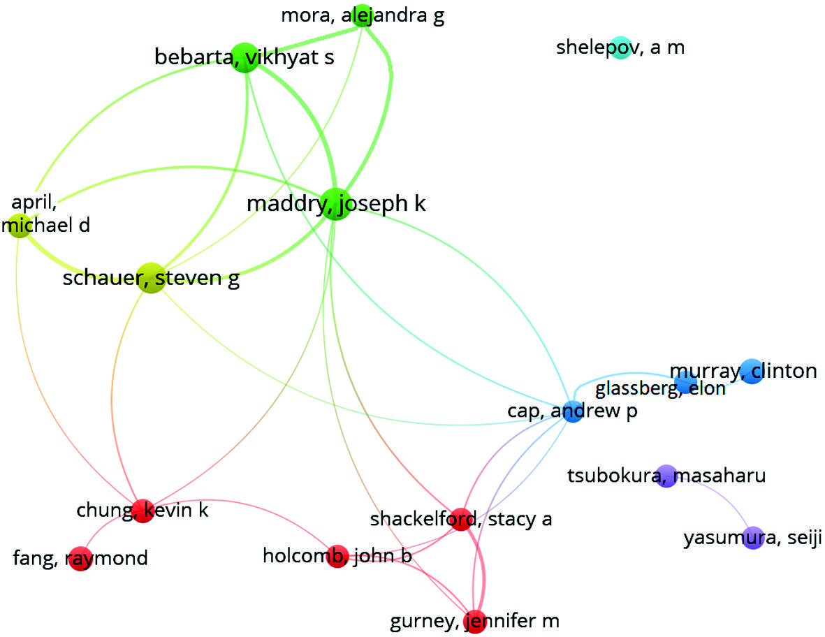 Кластерный анализ, проведенный с помощью аналитической программы VOSviewer, позволил определить основные тенденции научных исследований в зарубежной научной литературе открытого доступа, направленные, прежде всего, на изучение общих вопросов военной медицины, организации лечебно-эвакуационных мероприятий, медицинской эвакуации и оказания медицинской помощи в различных условиях (чрезвычайные ситуации, вооруженные конфликты), что подтверждается сформированными кластерами статей и взаимосвязанными с ними ключевыми словами.