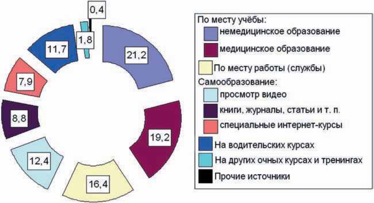 2. Что это было за обучение? | А. На водительских курсах Б. По месту учебы (немедицинское образование) В. По месту учебы (медицинское образование) Г. По месту работы (службы) Д. Самообразование (специальные интернет-курсы) Е. Самообразование (книги, журналы, статьи и т.п.) Ж. Самообразование (просмотр видео) З. Другое (указать) |