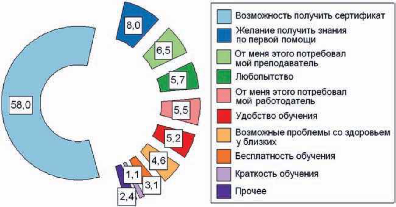 Conclusion. Poor public awareness of CPR training importance and limited availability of training are the major constraints in acquiring life-saving knowledge and skills. As a publicly available tool for remote self-training, including within blended distant-classroom learning, the free online training course opens up great prospects for extensive mainstreaming of first aid skills, offering broad public coverage. The majority of online training graduates are willing to engage in volunteer CPR teaching, thus providing additional opportunities to increase availability of CPR training.