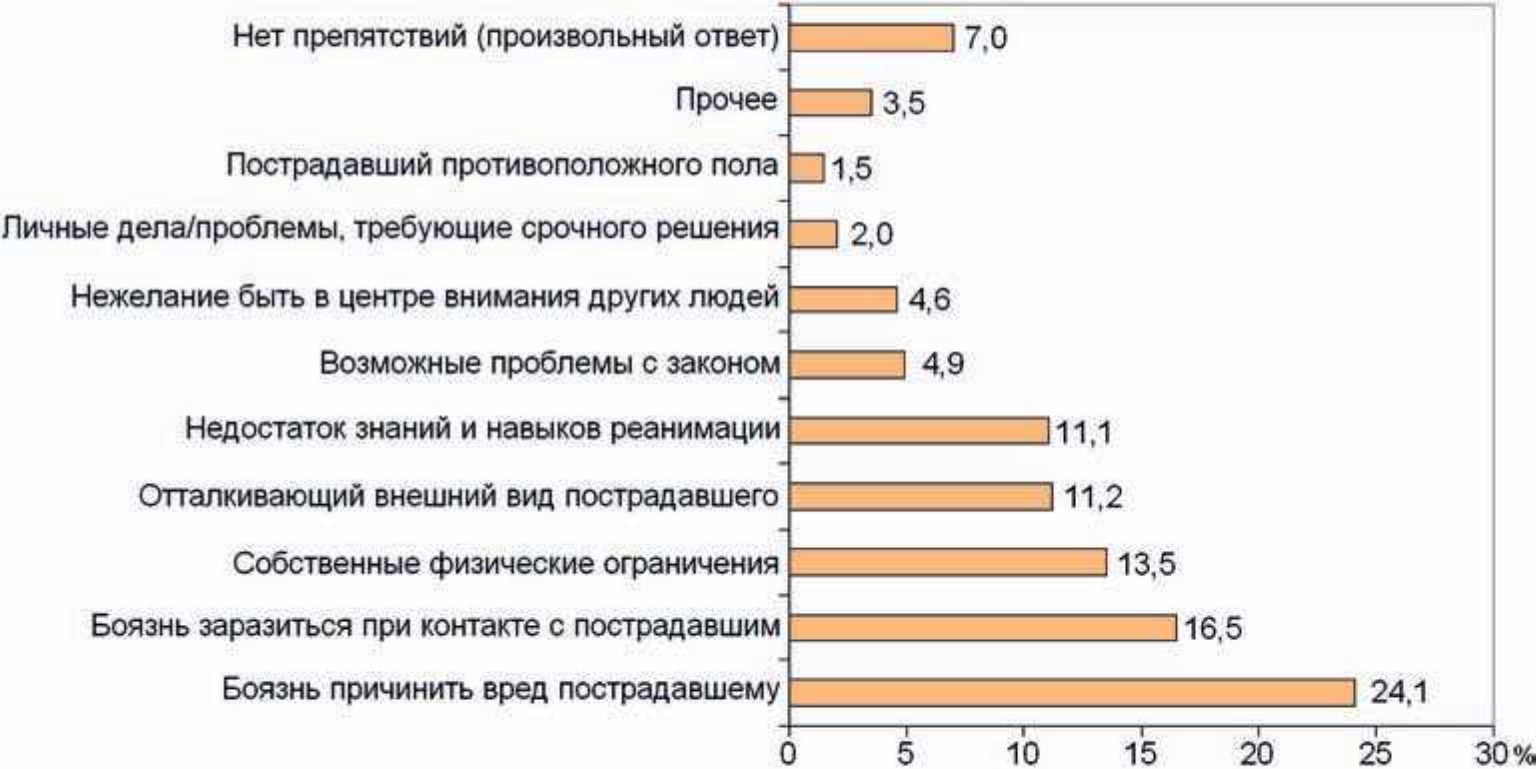 Дополнительным наблюдением настоящего исследования явилось распределение факторов, которые составляли для респондентов после прохождения ими обучения основные препятствия для проведения СЛР в предполагаемом случае ОС у незнакомого человека. Наиболее распространенными барьерами, о которых суммарно сообщили более трети респондентов, оказались боязнь причинить вред пострадавшему и заразиться при контакте с пострадавшим. Сходные препятствия описаны как превалирующие в публикациях данных социологических опросов, проведенных в разных странах в общих популяциях [7, 11, 16, 32]. Вместе с тем, одно из наиболее часто выявляемых при опросах населения препятствий – недостаток знаний и навыков оказания ПП [7, 11, 16] – в настоящей выборке сообщалось как главный барьер только небольшим числом (11 %) респондентов, что, по-видимому, является следствием приобретения большей уверенности в собственных знаниях благодаря пройденному обучению.