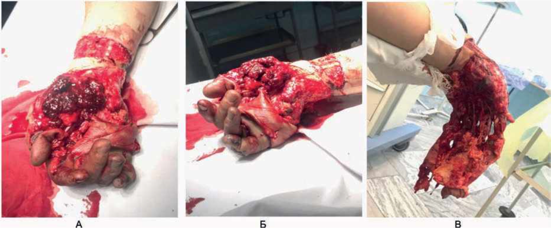 Рис. 1. Обширная открытая отслойка кожи обеих кистей, закрытая ограниченная отслойка кожи дистальных фаланг обеих кистей. Правая кисть, ладонная поверхность – вид сверху (А), вид сбоку (Б), левая кисть (В).